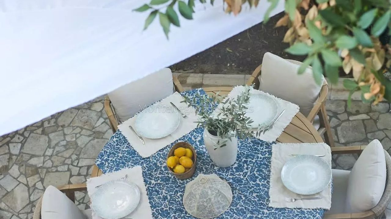 На участке имеются два парковочных места, красивый двор с оливковыми деревьями, оформленный в средиземноморском стиле, и бассейн.