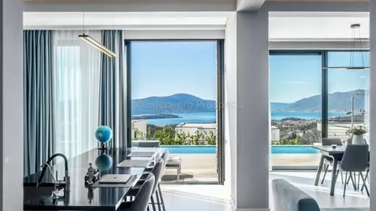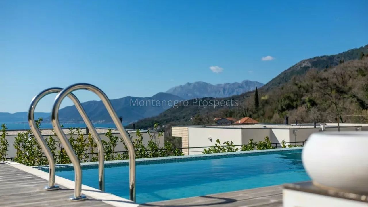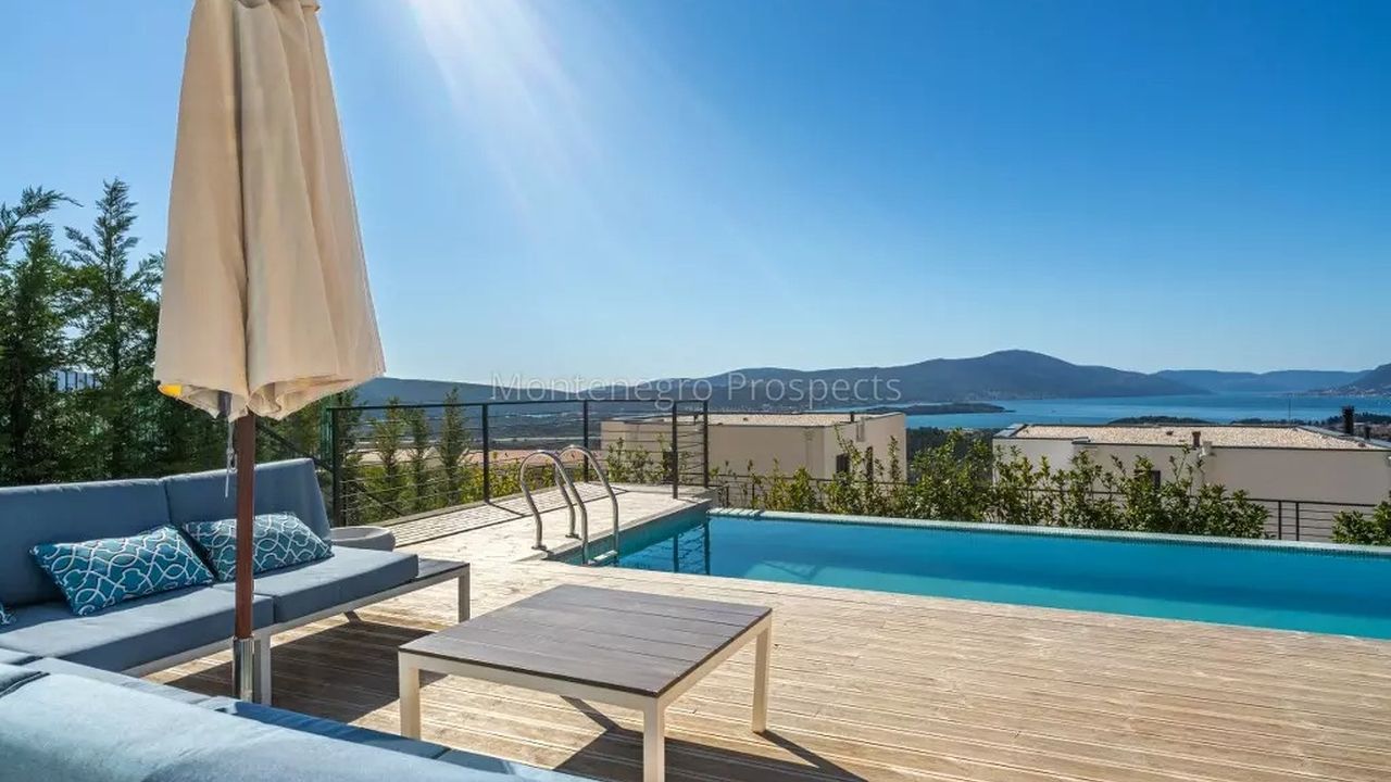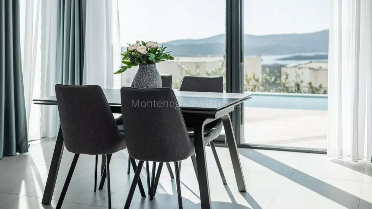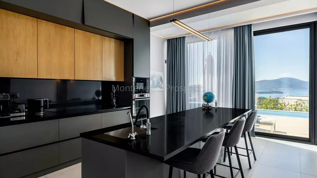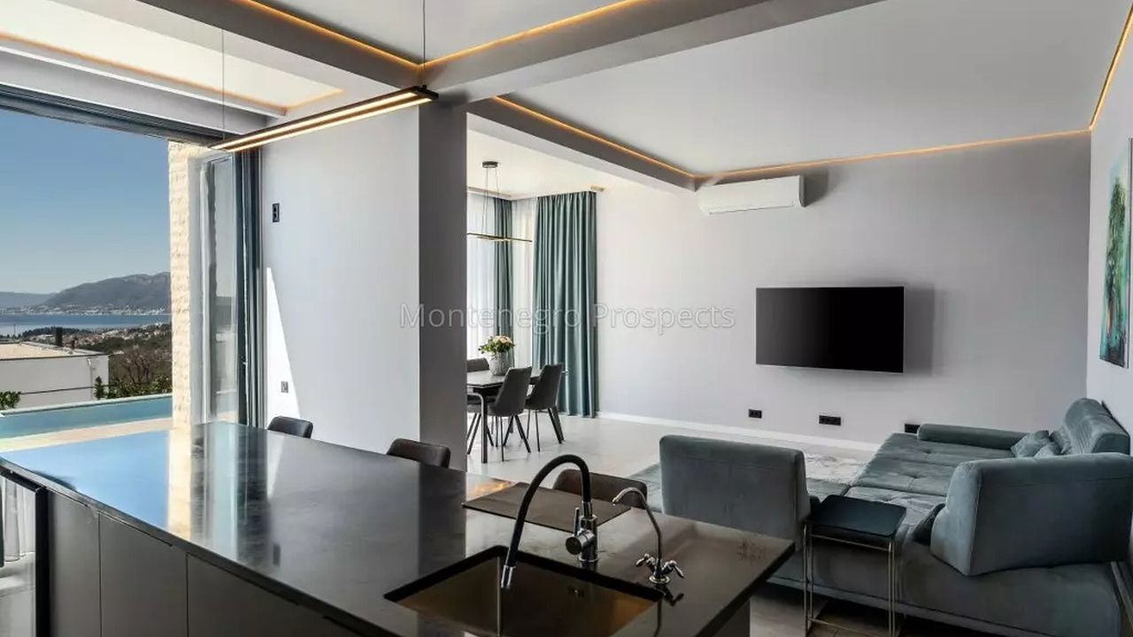 Из гостиной есть прямой выход на террасу и к подогреваемому инфинити-бассейну (8.5 × 3.5 м) с захватывающим видом на Бока-Которскую бухту.