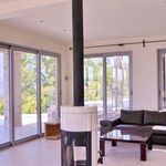 На первом этаже расположены: гостиная с кухней и обеденной зоной, спальня, ванная комната, кладовая. В гостиной – панорамное остекление, круговой камин и выход на террасу с бассейном.