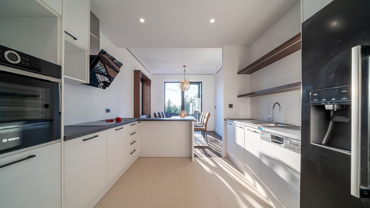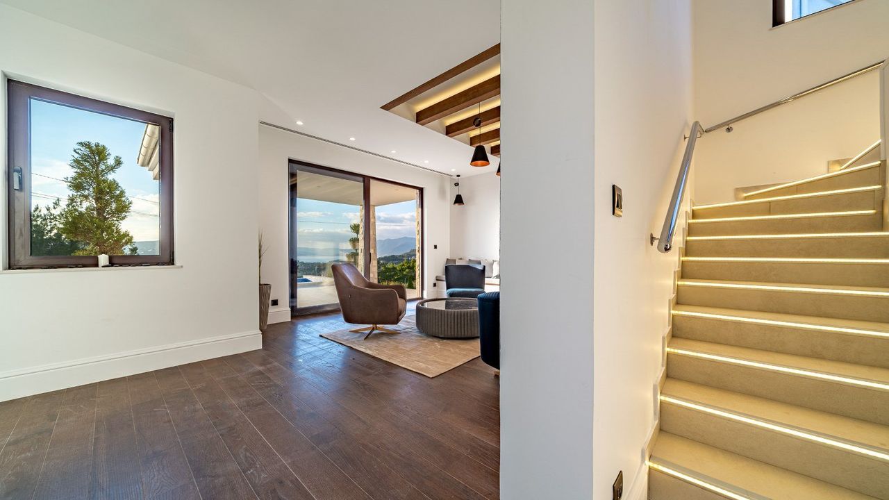 Эта роскошная, недавно построенная вилла занимает два уровня и состоит из просторной гостиной открытого плана с кухней и столовой, кладовой и технической комнаты и с/у. Внутренняя лестница ведет на верхний уровень, где расположены две спальни и ванная комната. Главная спальня выходит на собственный балкон с видом на море.