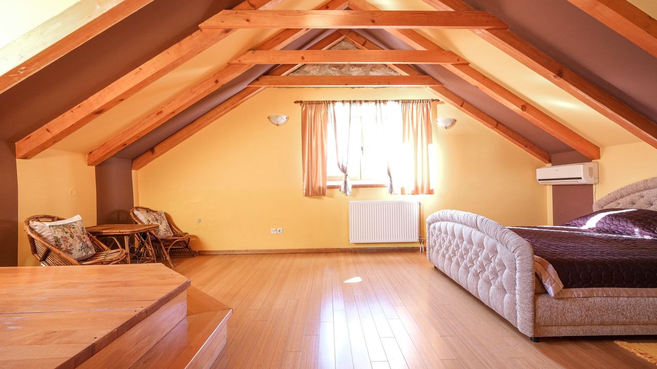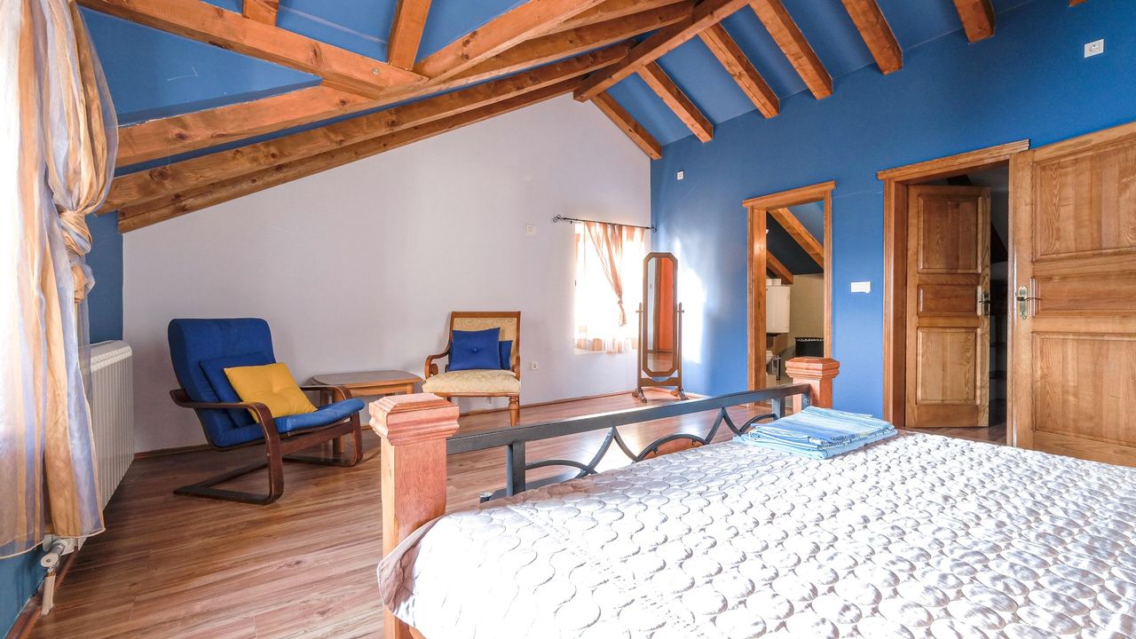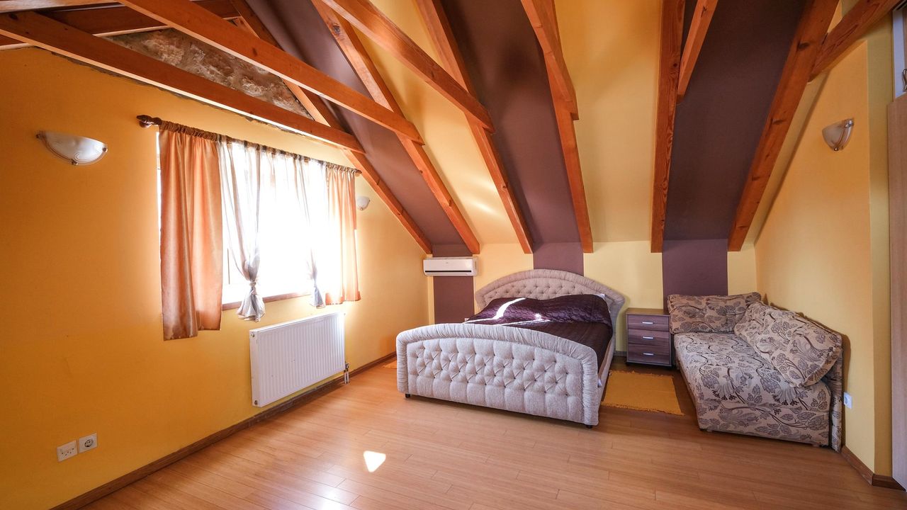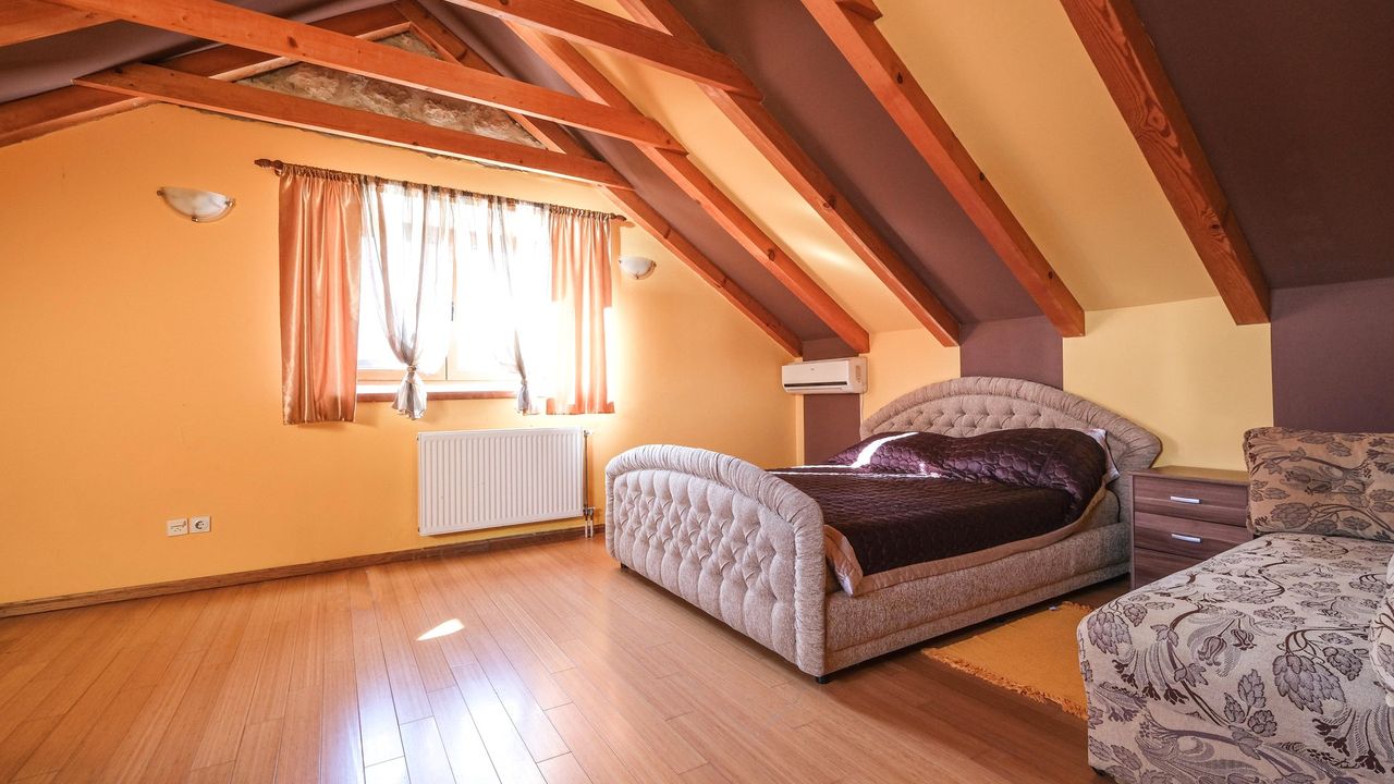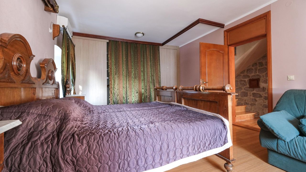 На третьем этаже располагается большая спальня с ванной комнатой и гардеробной, обеспечивающая уединение и комфорт. Флигель на втором этаже включает ванную с душ-кабиной и спальню с двумя антикварными кроватями, а мансарда предлагает дополнительное пространство с ванной и спальней на подиуме.