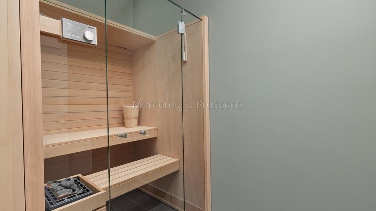 В центре, открываясь двустворчатыми дверями двойной высоты, находится комната Flexi (ТВ, йога, тренажерный зал) и вход в сауну.