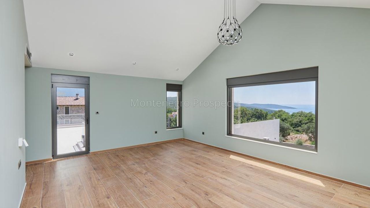 Центральным элементом помещения с высоким сводчатым потолком является большое окно с картиной, из которого открывается захватывающий вид на море. Слева - дверь на большую стеклянную террасу на крыше, вымощенную известняком, с панорамным видом на Адриатическое море и горы Ловчен.