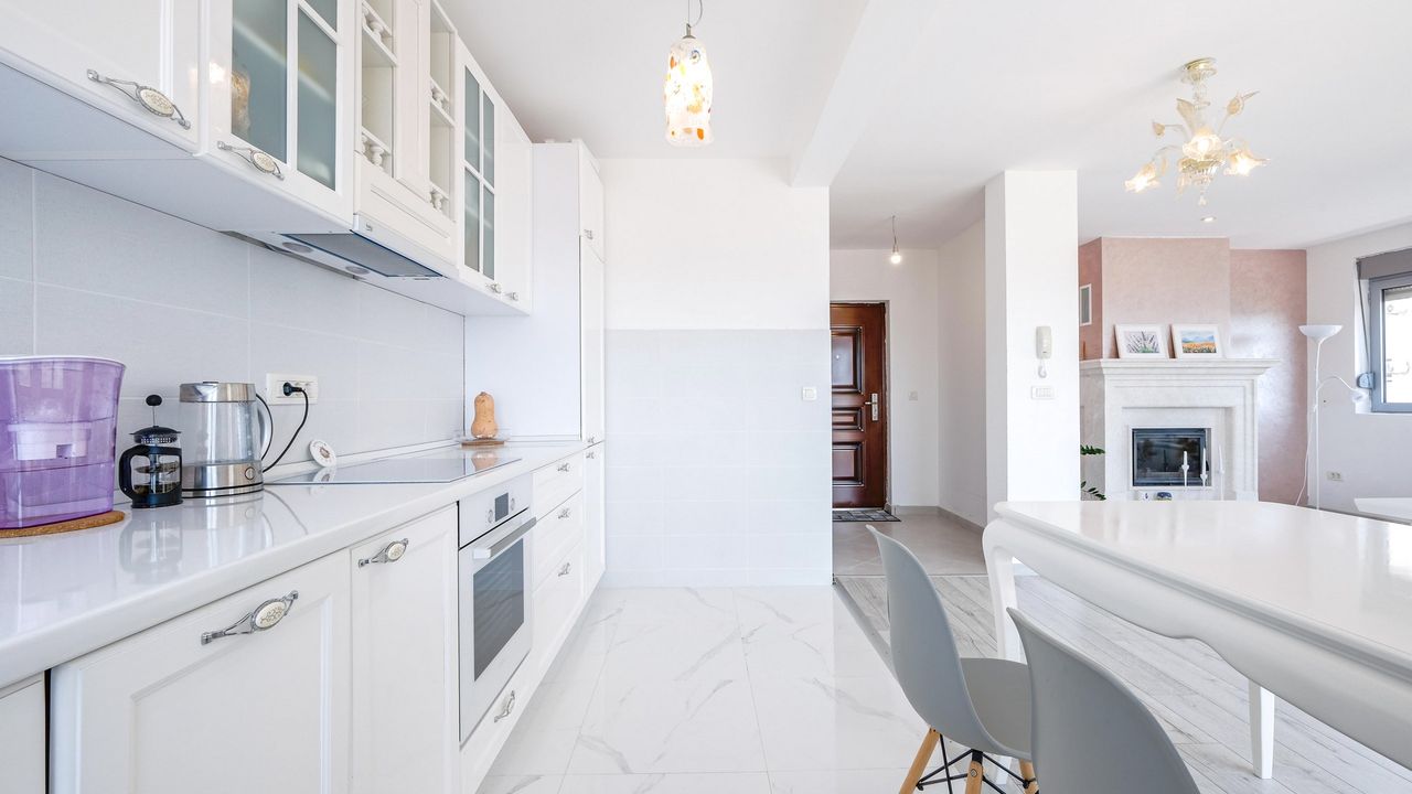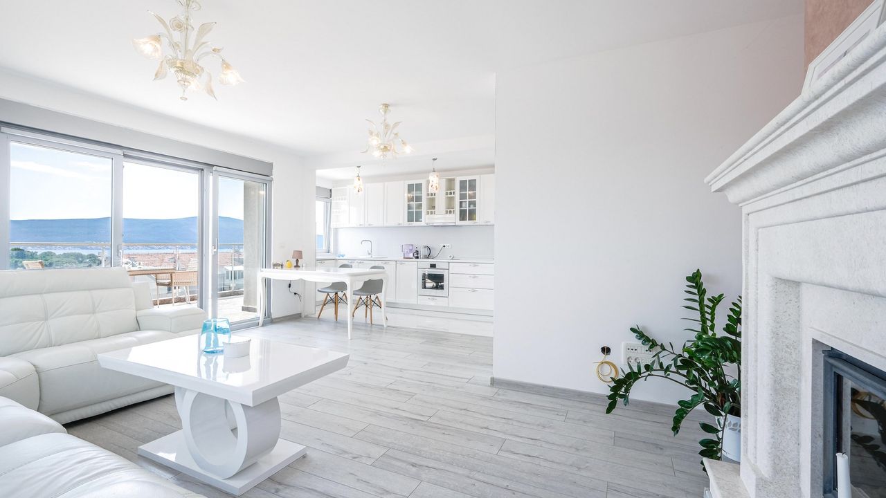 Пентхаус состоит из просторной гостиной с красивым камином и кухни со столовой, 3 спален, 2 ванных комнат, кладовой и большой террасы с панорамным видом на город и море. В гостиной установлена итальянская мебель и люстры из итальянского и муранского стекла. Это единственная квартира на этаже, поэтому при желании вы можете использовать лестничную площадку и отгородить её.