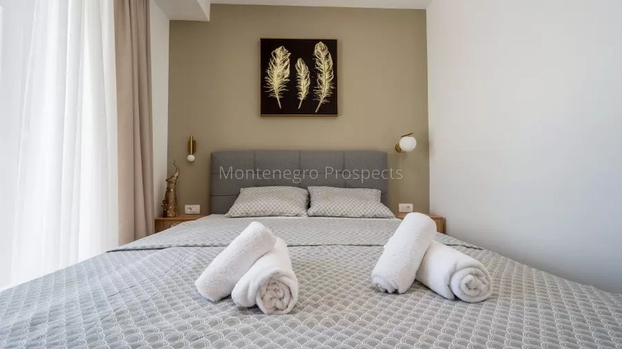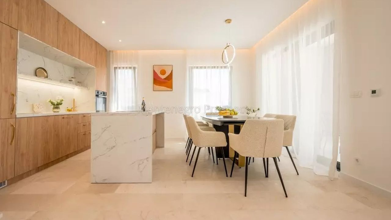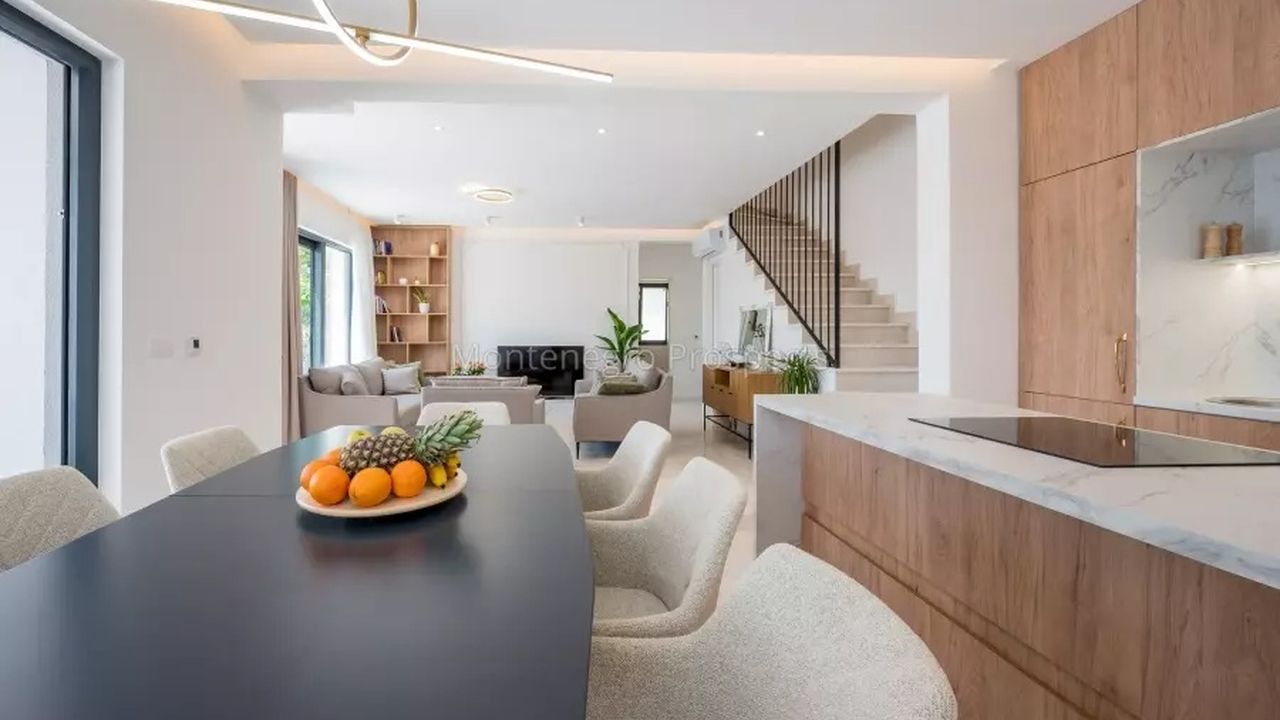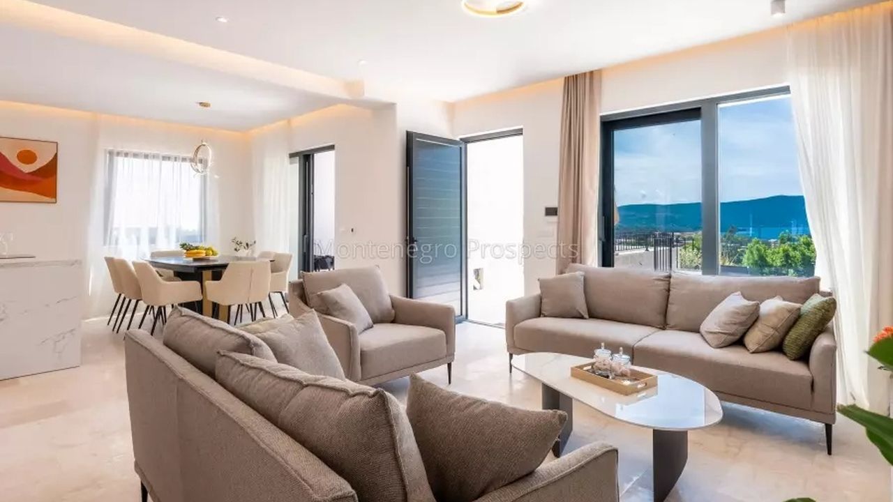 Всего в 5 минутах езды от аэропорта Тиват, в районе Мрчевац, продается роскошная современная вилла с красивым переливным бассейном и впечатляющим панорамным видом на Тиватский залив.
