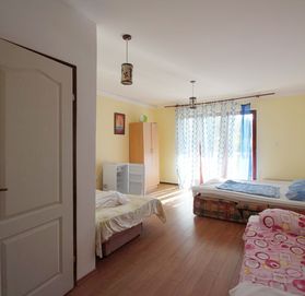 На втором этаже – четыре номера студии (в каждом своя ванная комната), широкий коридор, общая кухня/столовая. Из двух номеров и кухни выход на просторную террасу.