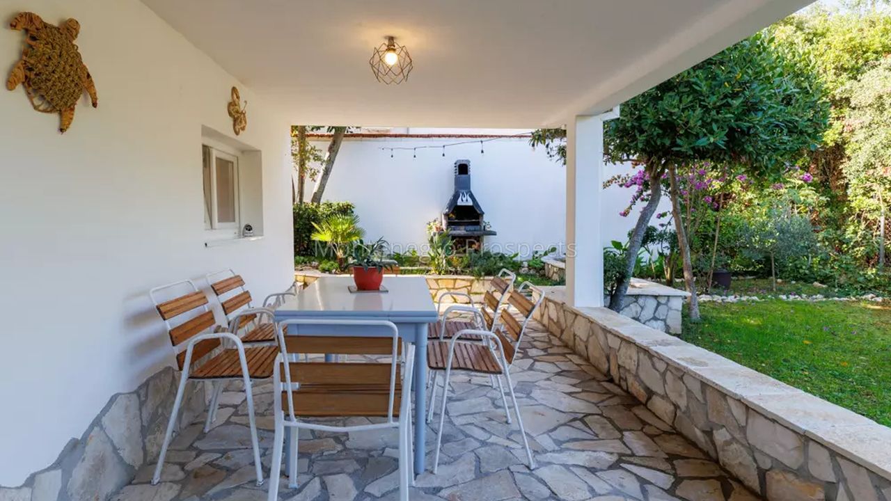 Участок огорожен. На территории растут олеандры, апельсин, мандарины, лимон, кумкват, мушмула, маслина, розмарин, лавр, живая изгородь, розы, бугенвилия и дикий гранат. Есть оборудованная зона барбекю.