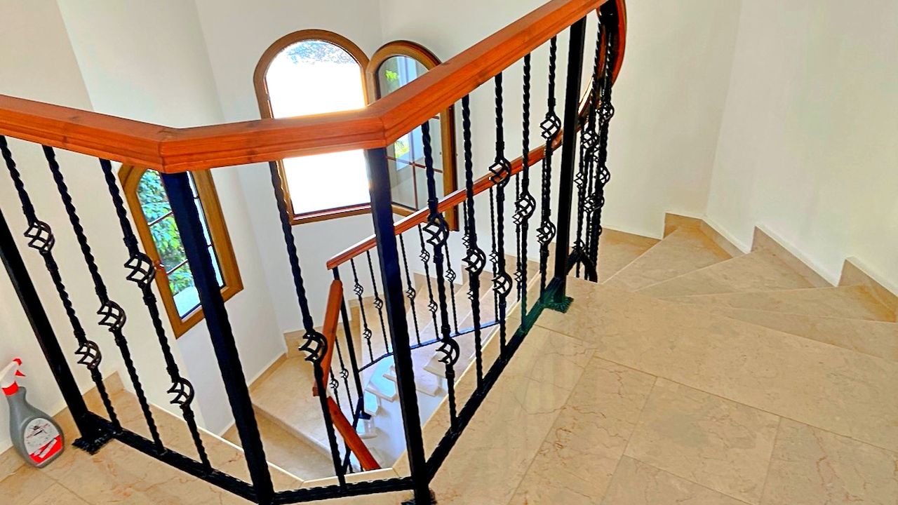 Просторный дом имеет отдельную кухню, гостиную с камином, гостевой туалет. Из кухни есть выход на крытую террасу. На втором этаже три просторные спальные комнаты, где главная спальная с собственной душевой. Все спальный комнаты с балконами с видами на море и горы.