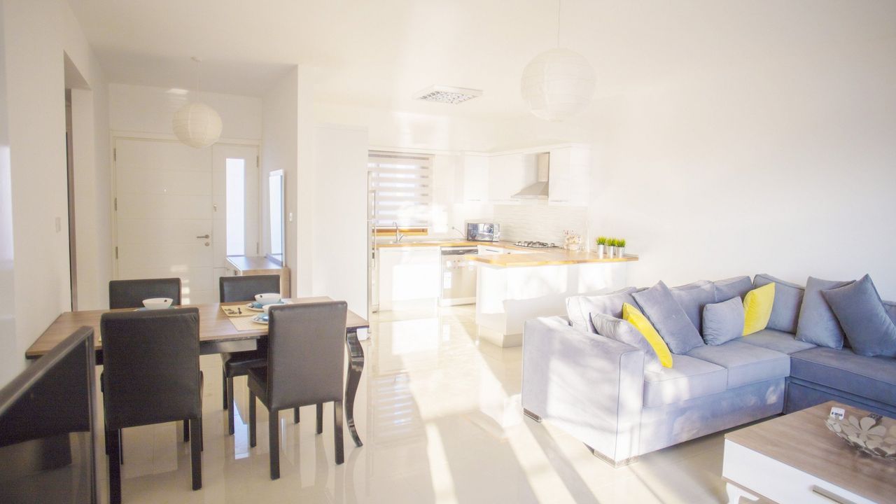 Большой салон совмещённый с кухней, две большие спальни со встроенными шкафами-купе, два санузла с душем, двойные стеклопакеты, очень уютная терраса с выходом к бассейну.