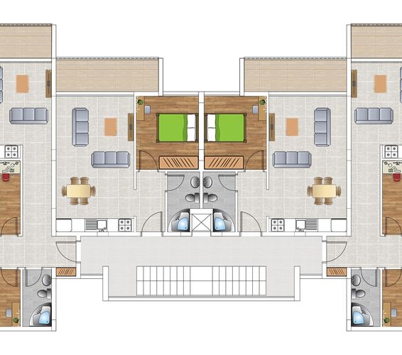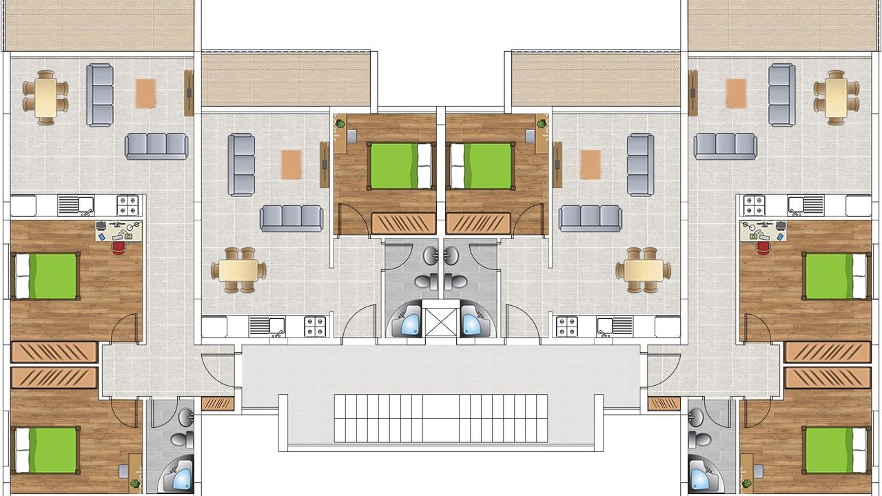 Современный, просторный комплекс находится в поселении Алсанжак, в уютном малозастроенном месте. Природный овраг словно очерчивает границы комплекса на западе, отделяя его от шумной, развитой инфраструктуры и предоставляет спокойствие и комфорт жителям.