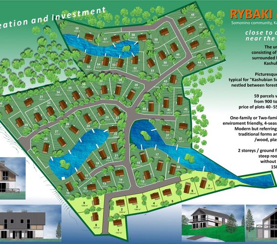 Проект состоит из 59 участков площадью 900-2000 кв.м., предназначенных для строительства жилой недвижимости - двухэтажных домов на 1 или 2 владельцев. С каждого из участков будет открываться великолепный вид на лес и озера.