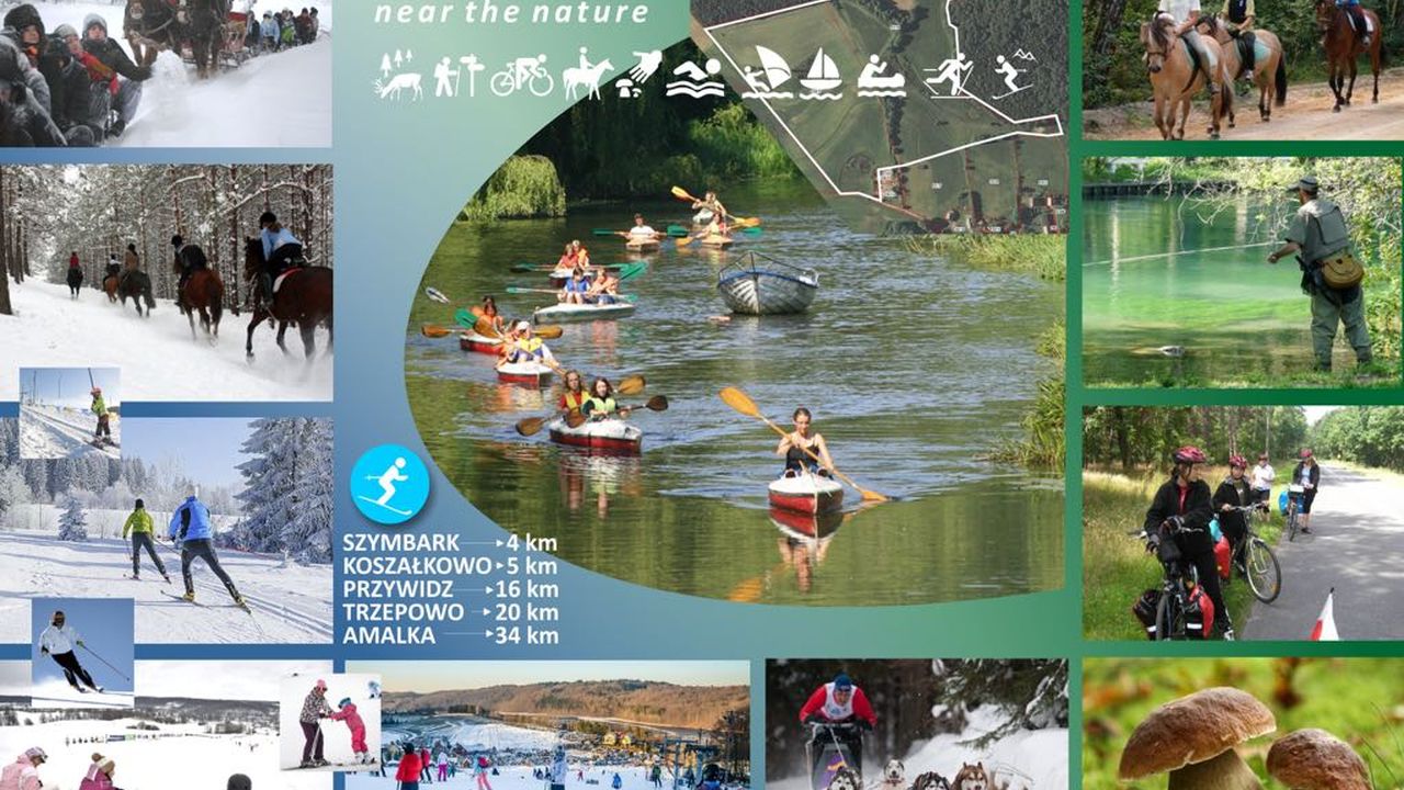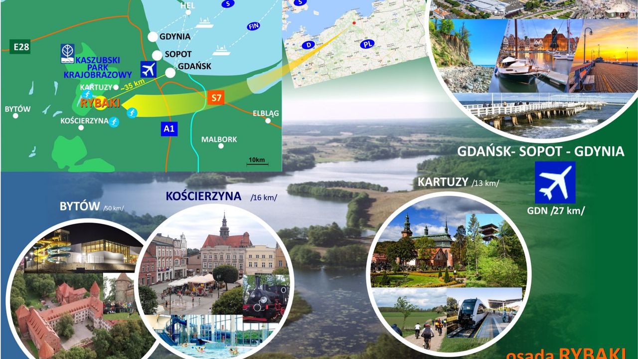 70% территории граничит с Национальным природным парком (Kashubian Landscape Park, площадь 332 кв.км) и хвойным лесом