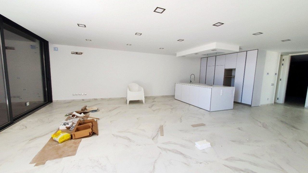Гостиная / столовая с оборудованной кухней, открытой планировки и с выходом на большую террасу площадью 90 м2, 3 спальни с ванными комнатами и 1 гостевая ванная комната.