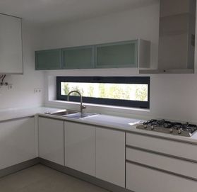 Первый этаж: прихожая, гостиная с выходом на бассейн и Сад, плностью оборудованная кухня, спальня/офис и ванная комната.