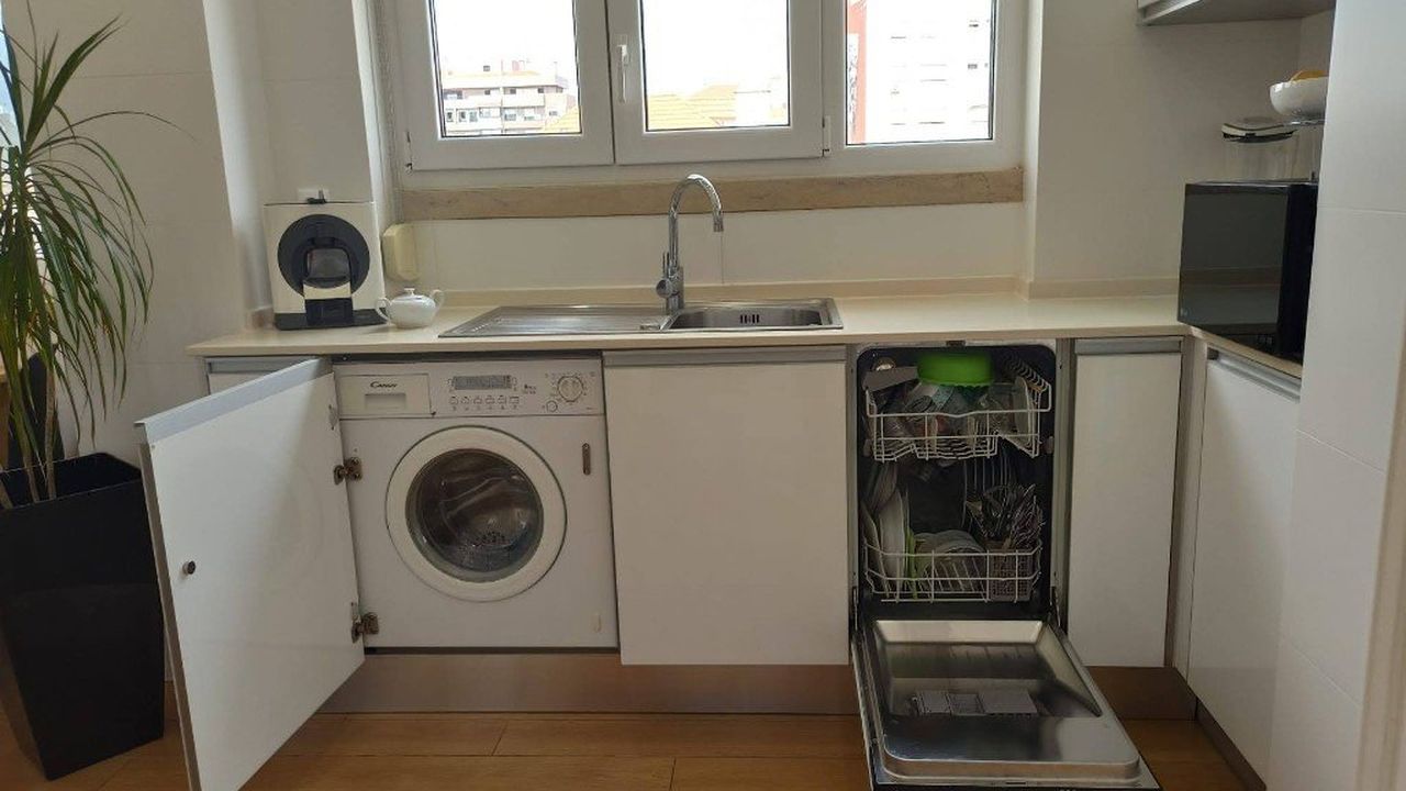 Полу-оборудованная кухня с посудомоечной машиной, стиральной машиной, плитой, духовкой, вытяжкой и обогревателем