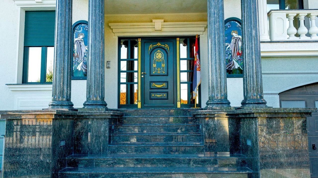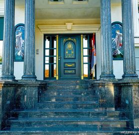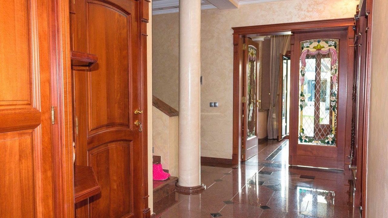 Во всех окнах деревянные пятикамерные стеклопакеты из махагона, снаружи махагон покрыт специальным зеленым покрытием. Стекла с зеркальным эффектом. Рольставни электрические. Все внутренние двери из массива махагона.