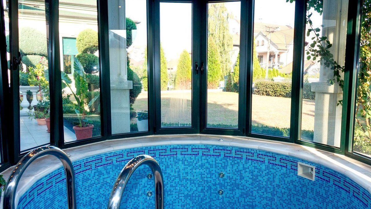 Отдельный вход в сауну с бассейном. Бассейн с джакузи, окна вокруг бассейна зеркальные. Есть туалет и универсальный тренажер.