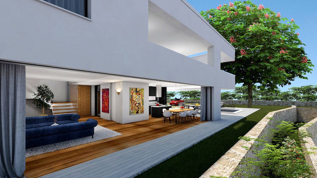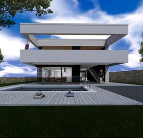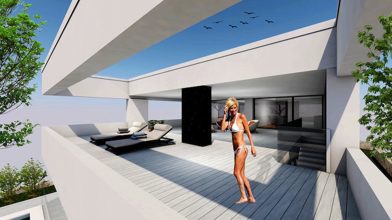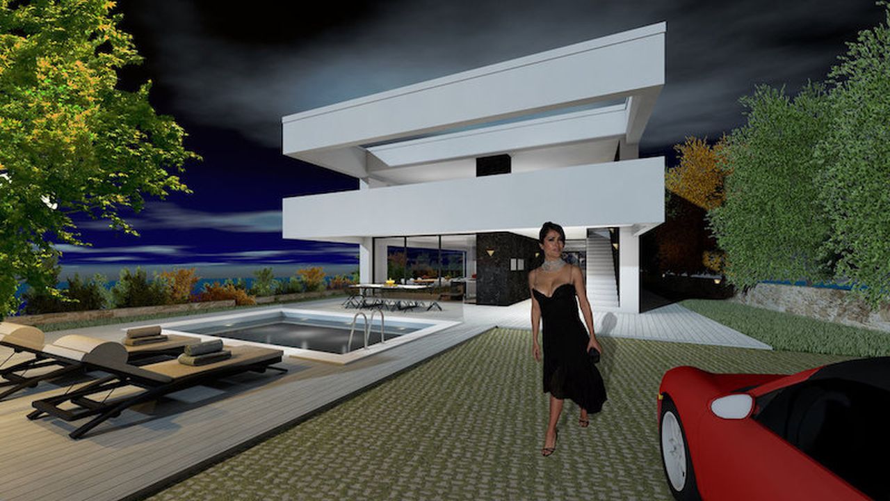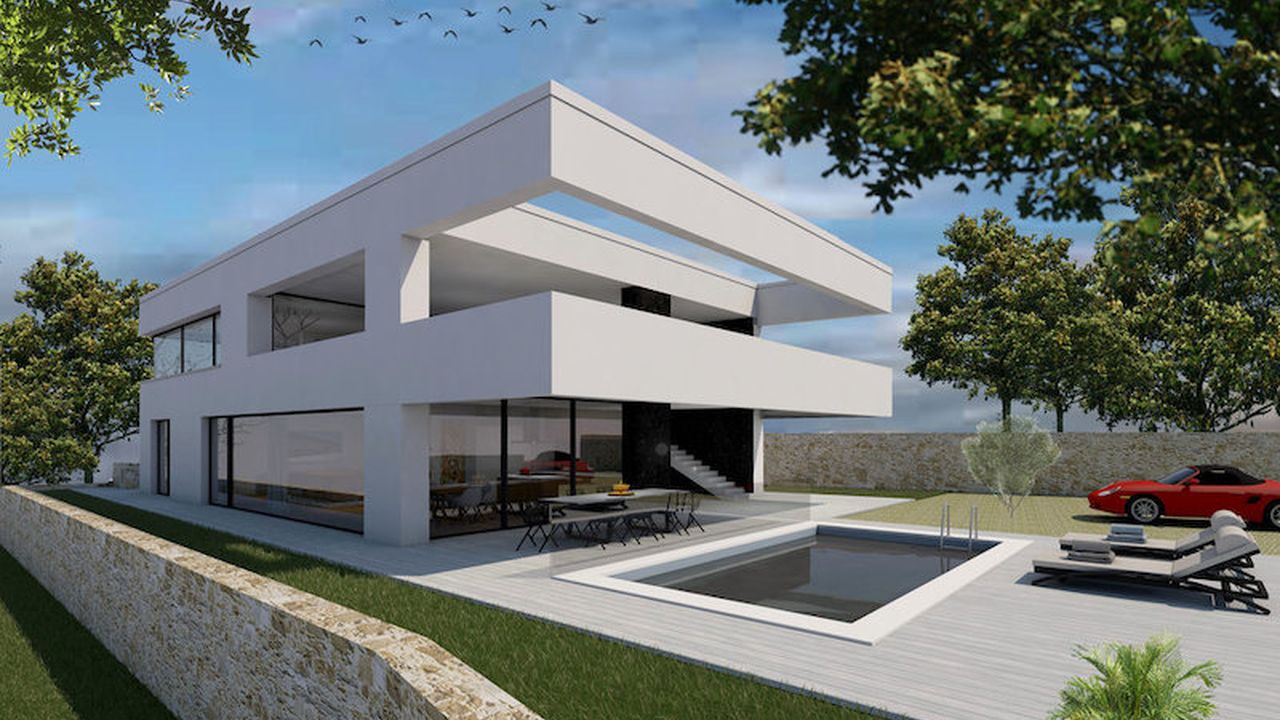 Building plot with stunning sea views and a valid building permit for a modern, detached house with a 406 m2 pool on three floors. The community contribution has already been paid and the construction of the house has been announced. An asphalt driveway leads to the plot. Immediate start of construction is possible.