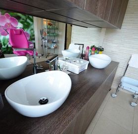 Салон красоты меблирован в современном стиле и состоит из следующих зон: ресепшн, большая комната с душем, меньшая комната с туалетом.