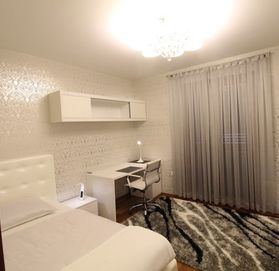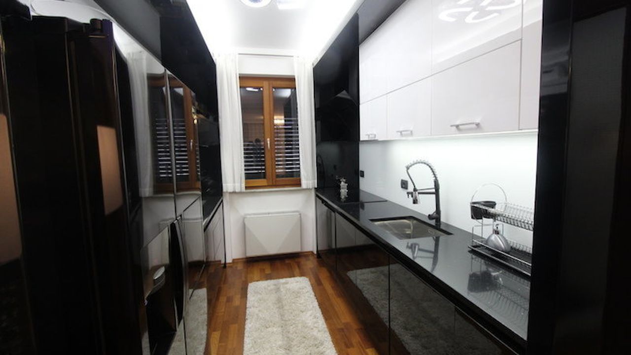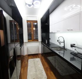 Apartment 96 m2 total area, incl. 81.6 m2 living space, 9.30 m2 terrace and 5.40 m2 basement. Finishes in an apartment of the highest price range, from wallpaper to small details on furniture such as handles (decorated with crystals) for the opening, kitchen and bedroom walls finished in velvet. The apartment also has a burglar-proof door. All windows are equipped with mosquito nets. The apartment also has a built-in water filter. The apartment has convectors for cooling and heating. Central gas heating is used in winter. The bathroom has an additional heated floor and the living room has a fireplace with bioethanol.