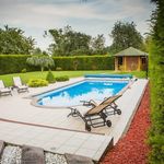 На юго-восточной стороне участка расположен открытый бассейн 10 м x 5 м. Рядом с бассейном в саду обустроена зона для барбекю с грилем и обеденным столом. В саду, который окружает дом, высажены декоративные кустарники и деревья.
