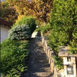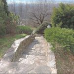 Парковка перед домом, каменная лестница ведет на первый этаж дома. Рядом с домом также есть хозяйственная постройка для хранения садового инвентаря.