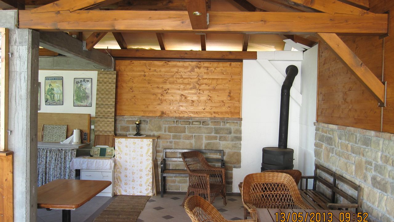 В отдельно стоящем здании находится летняя площадка с кухней и камином и крытой террасой.