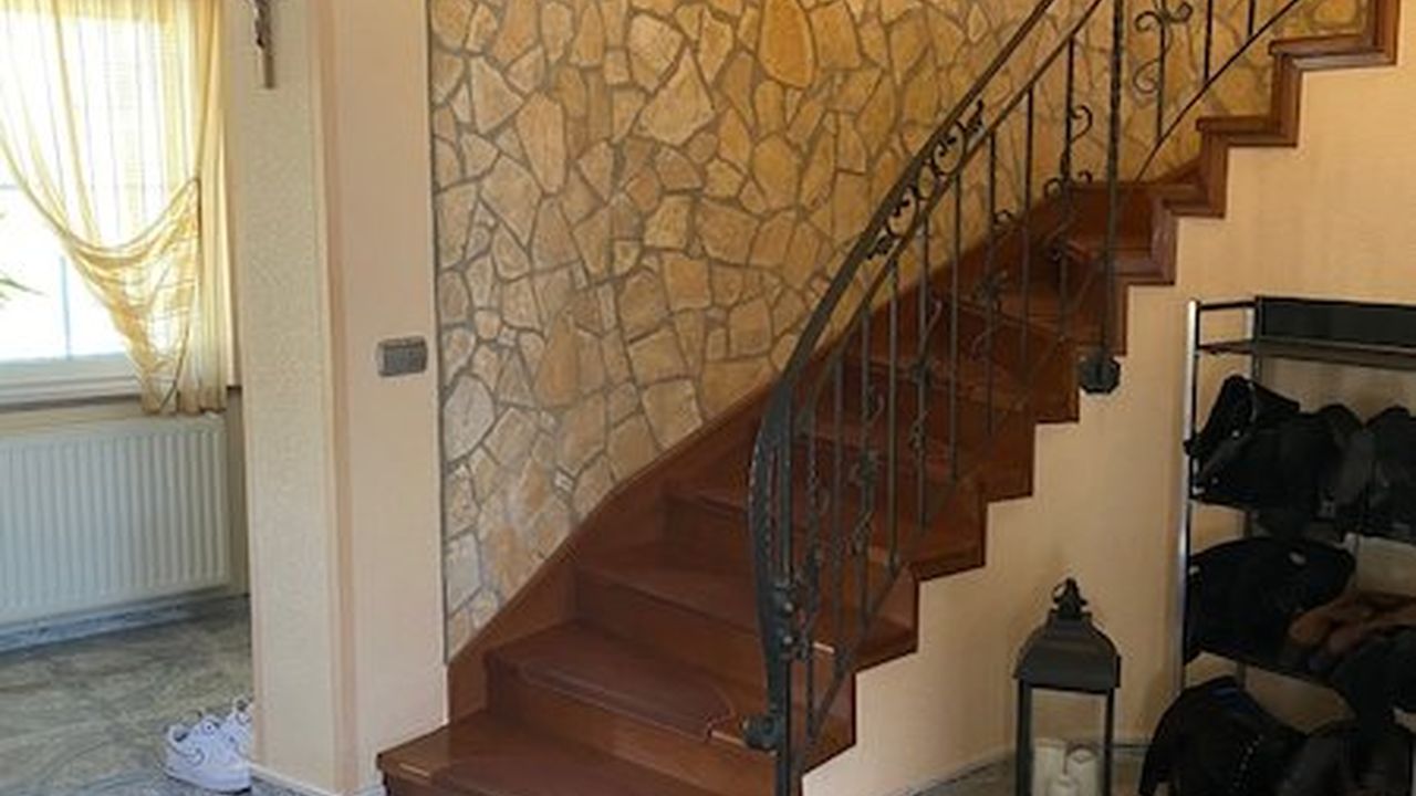 All equipment is custom-made. The roof is made of modular bricks (high-quality natural beaver stone roofing) and reinforced concrete slabs with horizontal and vertical ties, the walls are insulated with EPS 17 cm insulation. The floors in the corridor, kitchen and bathrooms are ceramic and marble tiles, the floors in the rooms are parquet. An oak staircase with wrought iron railings leads to the attic. The walls are partially decorated with Benkovac stone.