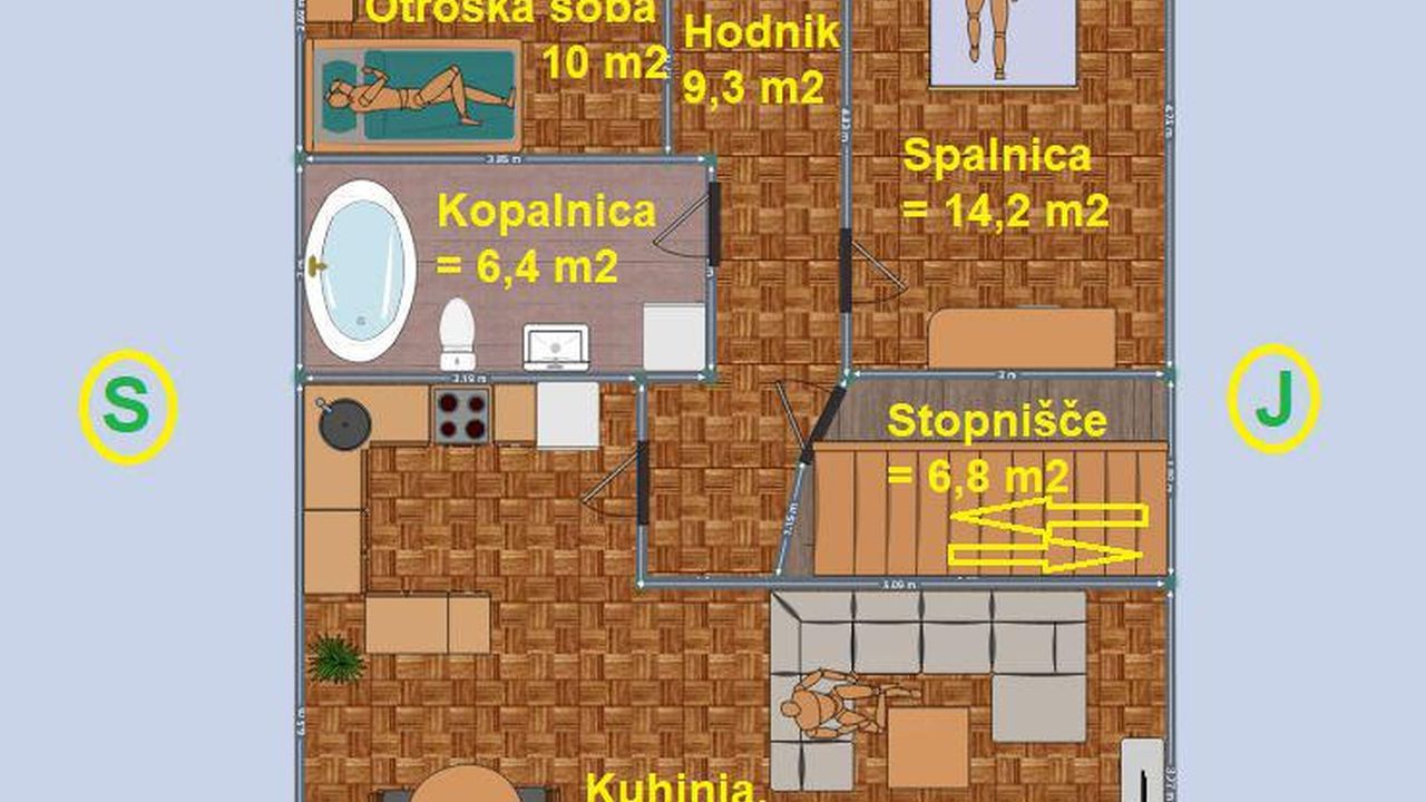 Первый этаж (79,1 м2 удобная площадь / 112,9 м2 неттоплощадки:) внутренняя лестница (6,8 м2), кухня с столовой и гостиной - открытый дизайн (39,2 м2) и выход на 13,4 м2 большой балкон, спальня (14.2 м2,) детская комната (10 м2) и ванная комната (6.4 м2), прихожая (9,3 м2) с выходом на 13,6 м2 большой террасы на спине; Размер потолков - 2,46 м.