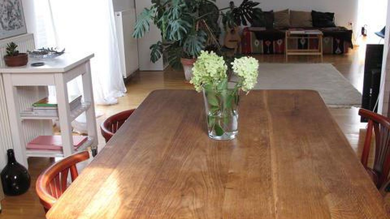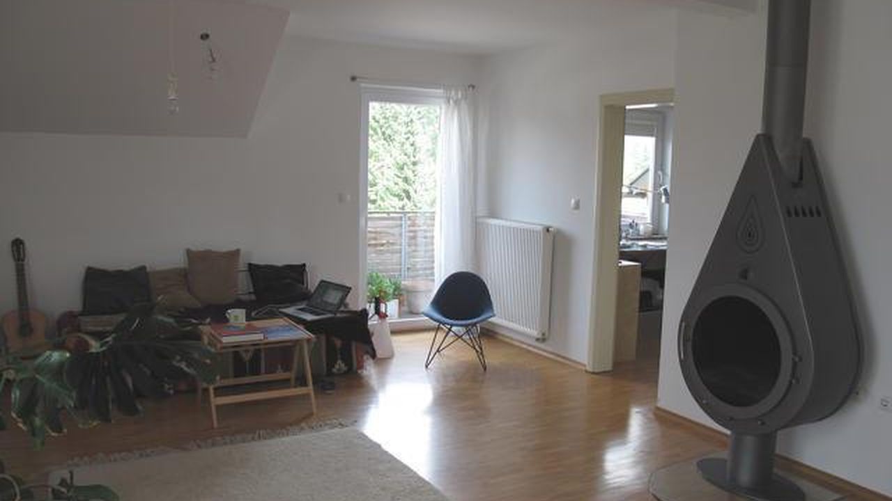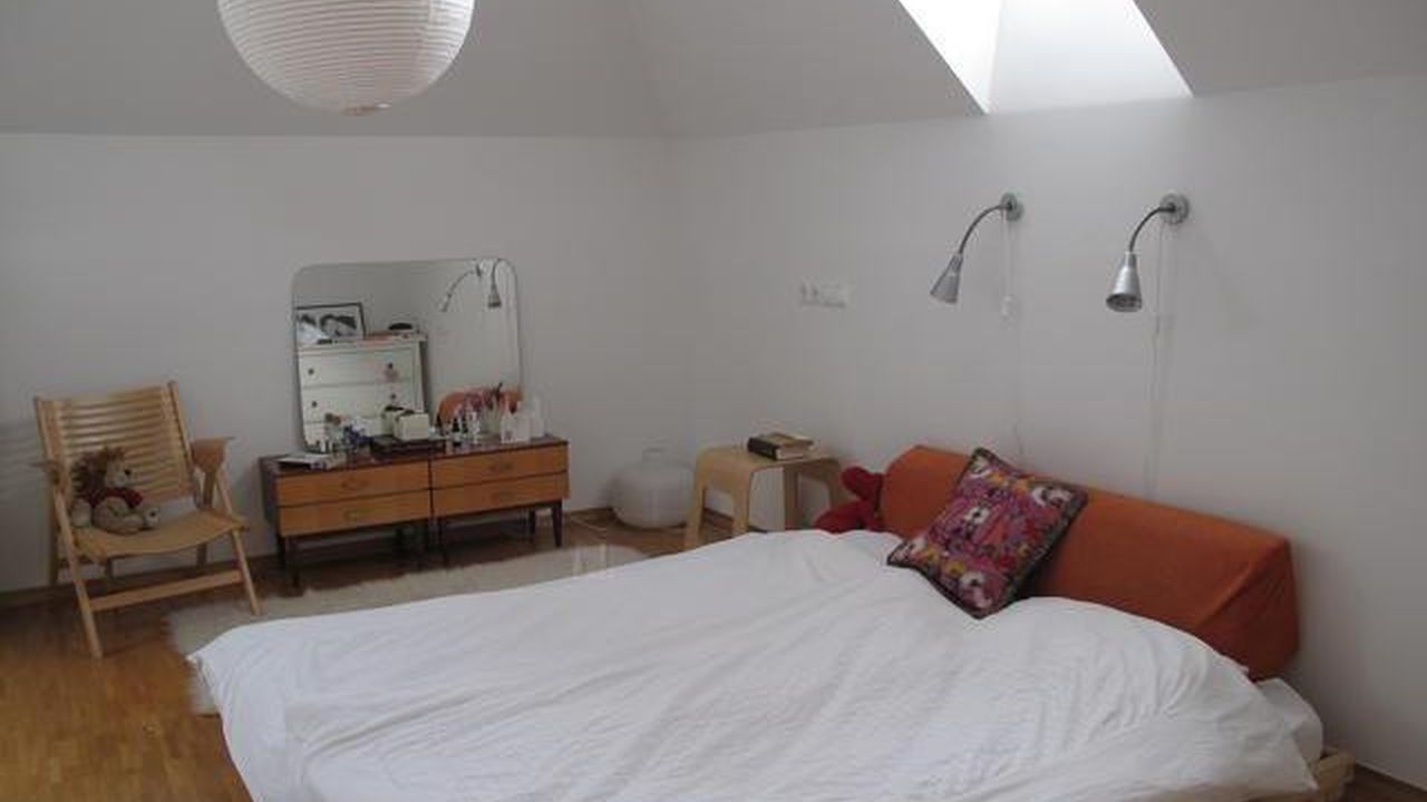 На мансардном этаже располагается полностью отремонтированная трехкомнатная квартира, которая состоит из гостиной с кухней и обеденной зоной, комнаты, спальни, двух ванных комнат, прихожей и котельной (газовое отопление). В гостиной установлен камин.