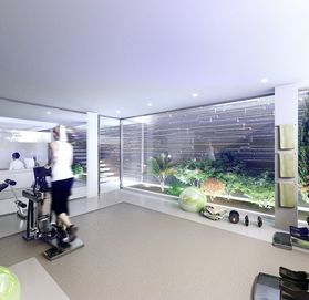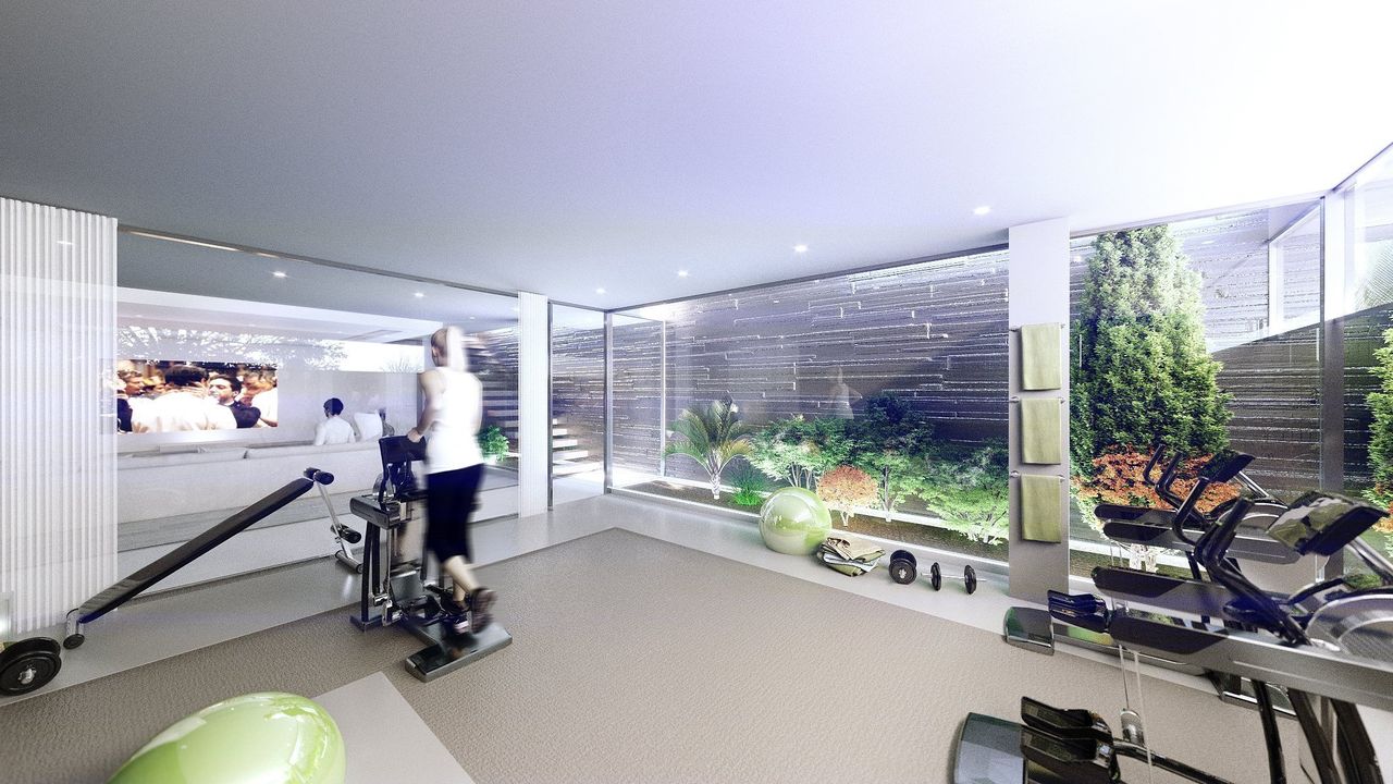 На первом этаже: прихожая, полностью оборудованная кухня, туалет и гостиная с выходом на веранду, а также пейзажный бассейн со стеклянной стеной, водопадом и видом на поле для гольфа.