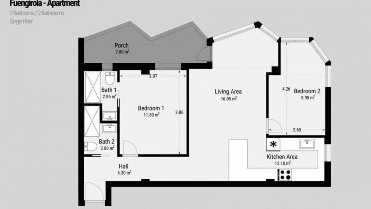 Апартаменты располагают большой гостиной с полностью оборудованной кухней, 2 спальнями с встроенными шкафами, 2 ванными комнатами и просторной террасой.