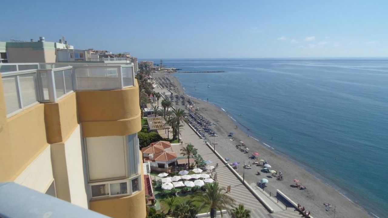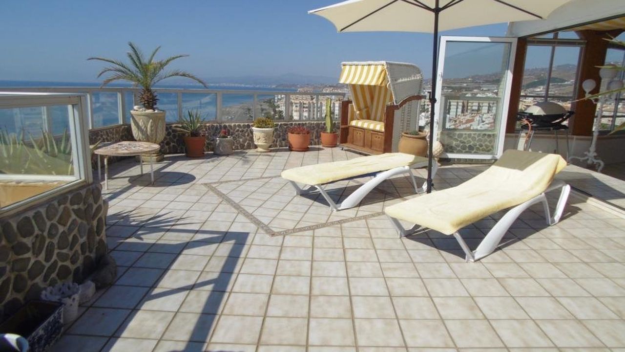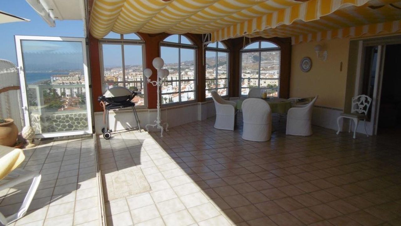 Ref: 1574 - Exclusive penthouse in the first beach line of Torrox Costa with a magnificent panoramic view. Living area 108 m2, conservatory 42 m2, outside terrace 47 m2, living / dining room with fireplace, fitted kitchen, 2 bedrooms, 2 bathrooms, adjoining rooms. Community pool and tennis courts in urbanization.