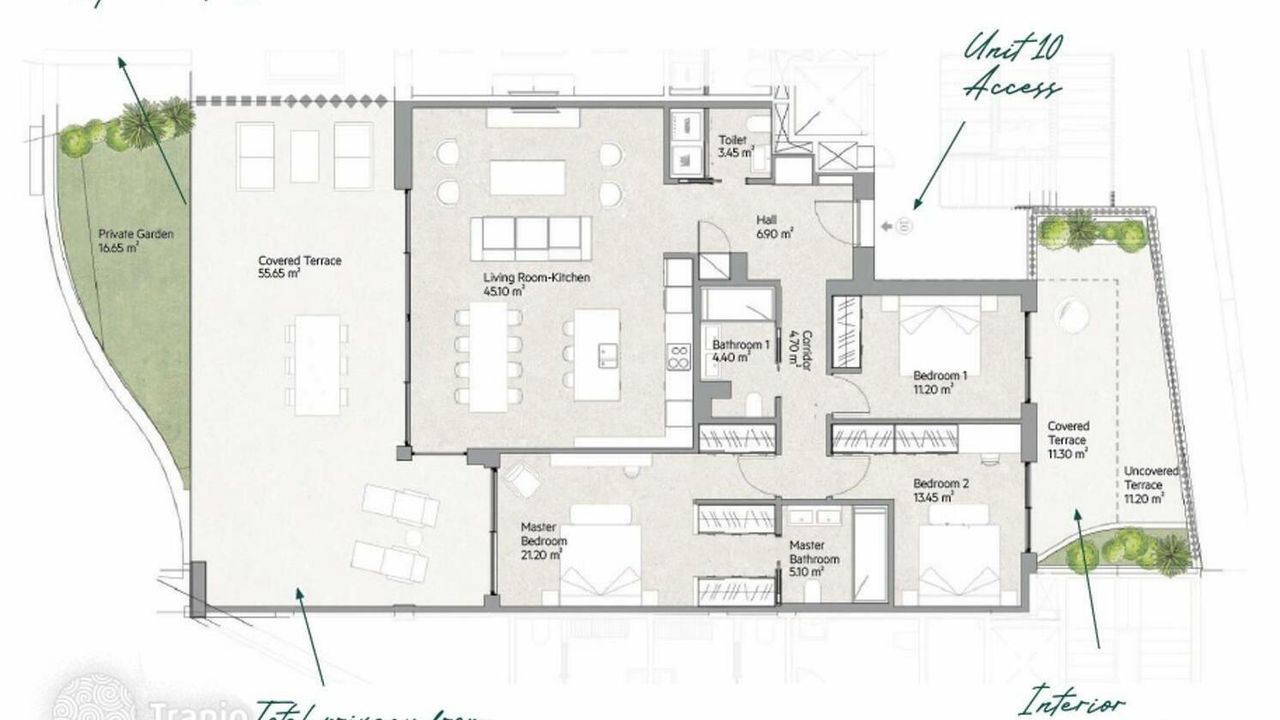 В общественных зонах вода играет центральную роль: два бесконечных бассейна и водяной фонтан гармонично интегрированы в сады и зоны с лежаками, создавая идеальную атмосферу для расслабления, наслаждения средиземноморским климатом и великолепными закатами.