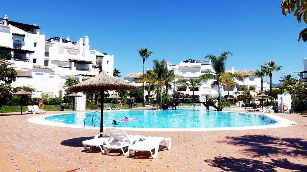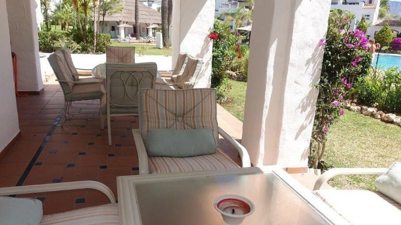 It is a ground floor apartment with a small separate garden and direct access to the communal pool. The apartment has three bedrooms. One bedroom has an en-suite bathroom with a walk-in shower and jacuzzi bath. The second bedroom has access to the main terrace and shares a bathroom with the third bedroom. There is also a guest toilet.