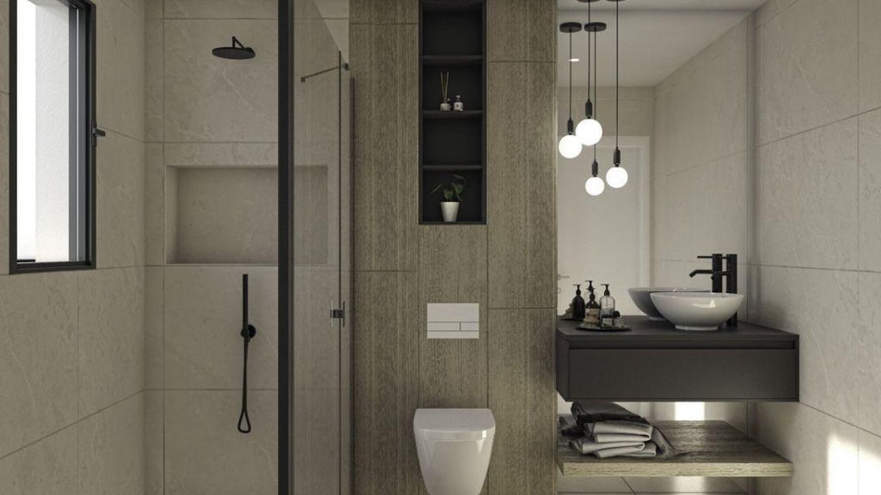 Полностью оборудованные ванные комнаты с прикроватным столом, умывальником, зеркалом, приостановленным туалетом, встроенными душевыми кабинами и стеклянными экранами.