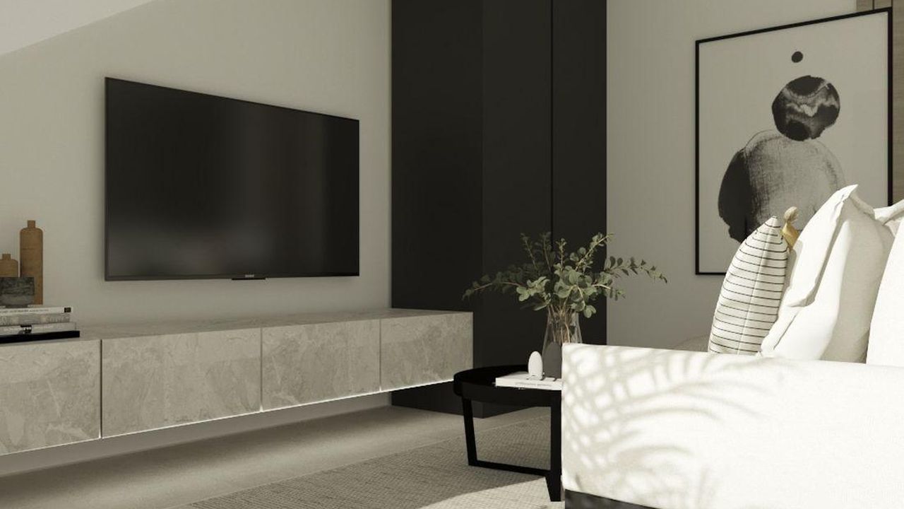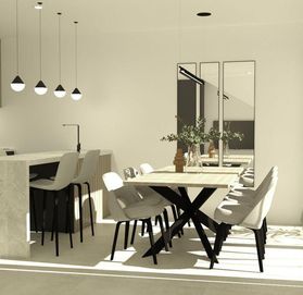 The two ground floor apartments have 3 bedrooms and 2 full bathrooms. The apartments are designed in a modern style and have an open plan consisting of an equipped kitchen and a living-dining room.