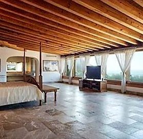 Первый этаж: две спальни с двуспальными кроватями, обе с ванной комнатой и балюстрадой в гостиной ниже первого этажа: кухня, столовая, впечатляющая гостиная и туалет