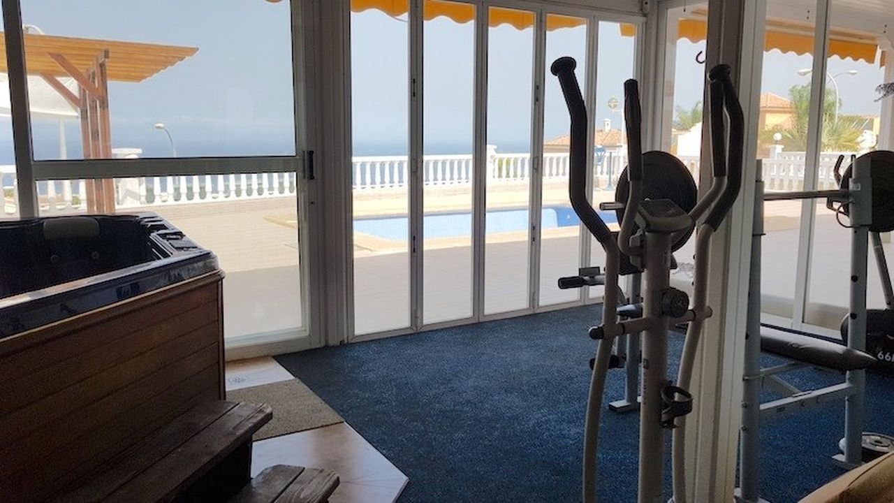 The villa has a gym, a jacuzzi with ocean views, a sauna, a room for relaxation.