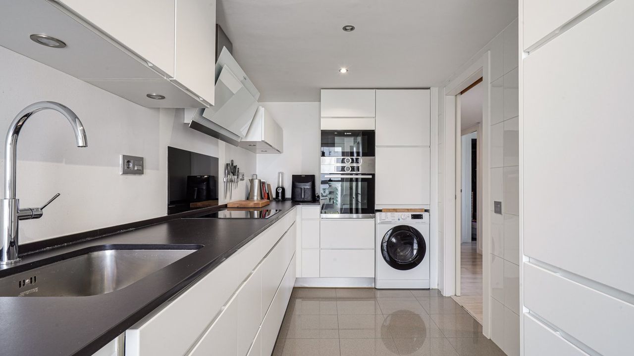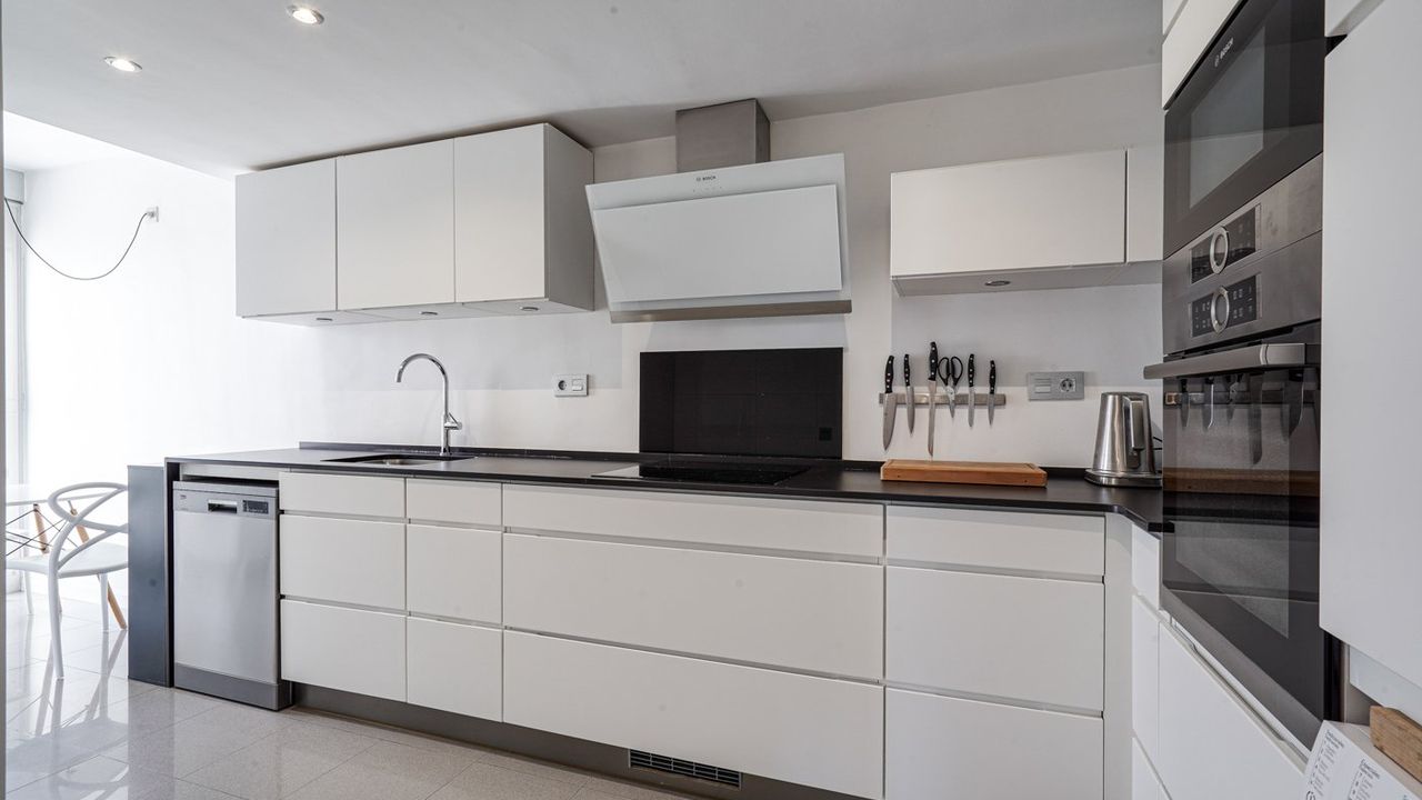 При входе нас встречает просторная гостиная и открытая современная кухня. Кухня полностью оборудована всей необходимой бытовой техникой и имеет качественную отделку.