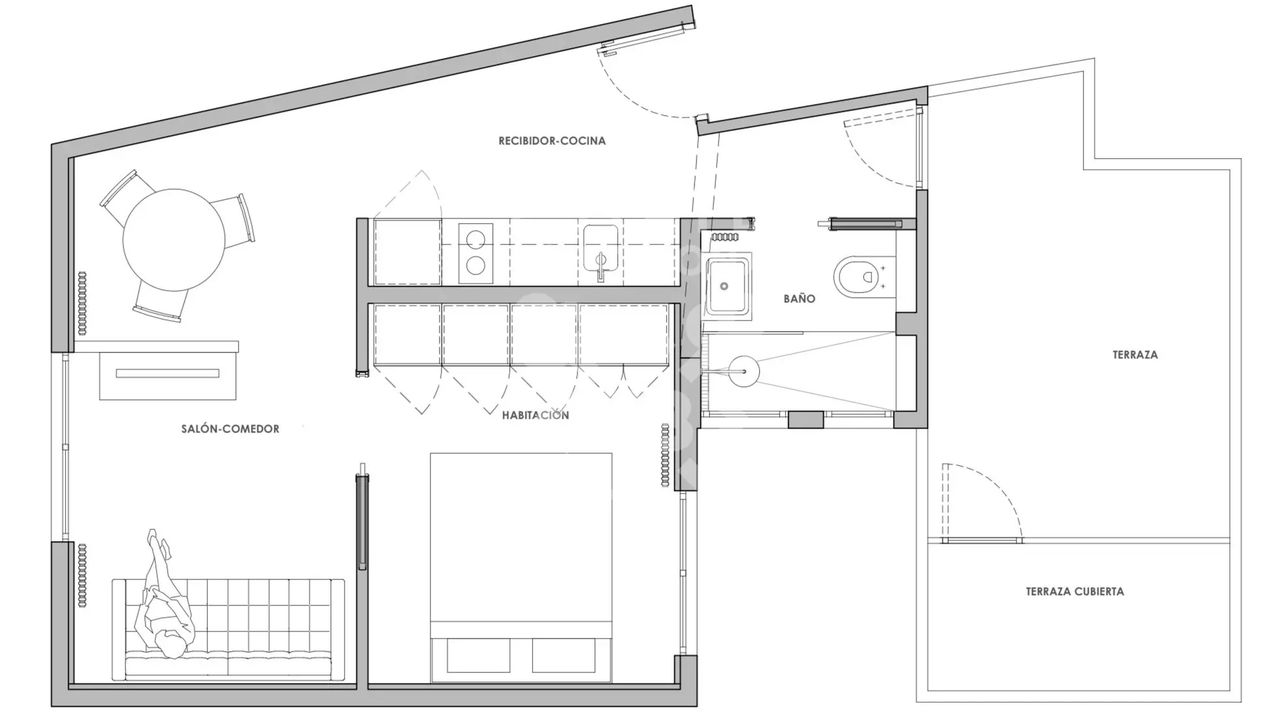 Уютная квартира в районе Эль Кармель, Барселона. Общая площадь составляет 49 м2 плюс 6 м2 общих зон, а также есть частная терраса, идеально подходящая для отдыха на свежем воздухе.