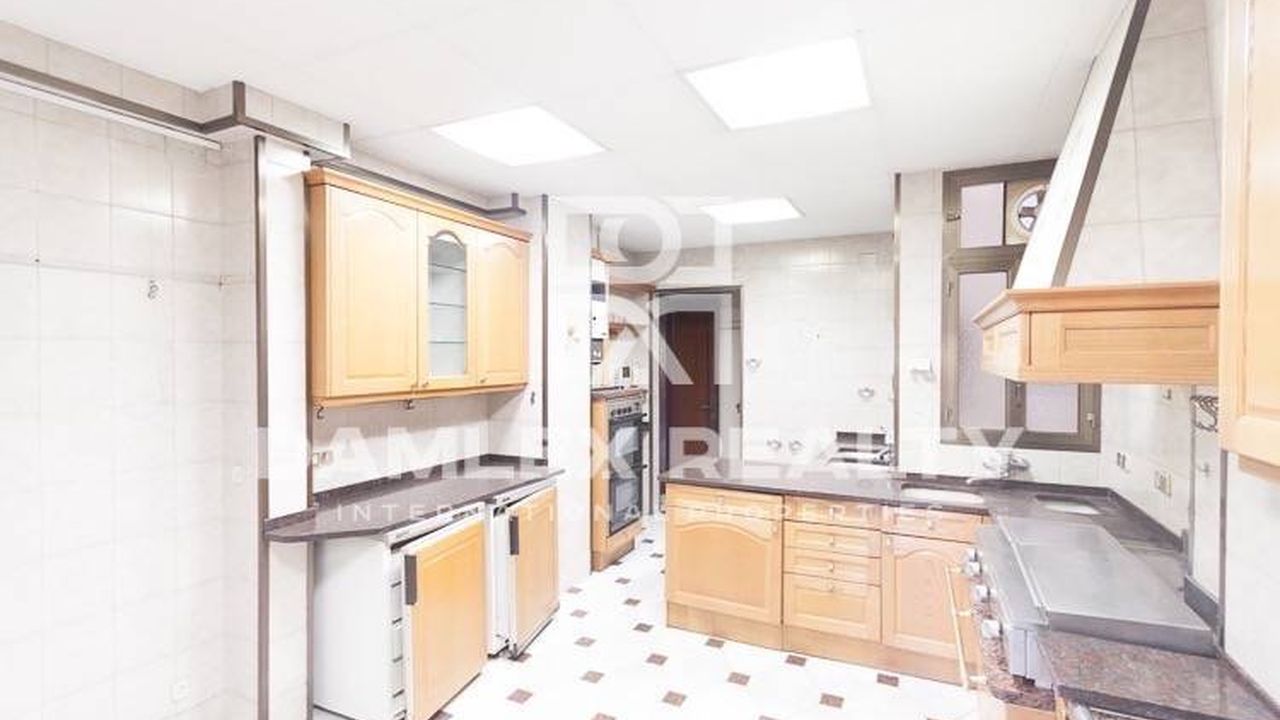 Квартира в 7 минутах ходьбы от района Барселоны Туро Парк. Данный район на протяжении многих лет пользуется очень большой популярностью среди именитых испанцев и обеспеченных иностранцев. Именно здесь предпочитают жить телеведущие, создатели и владельцы брендовых марок одежды, звезды кино и шоубизнеса. Район получил такое название благодаря парку, расположенному в самом его центре. Парк идеально подходит для прогулок всей семьей, в парке есть детская площадка. В районе есть магазины и рестораны, кондитерские лавки, банки и медицинские центры. Рядом есть остановки общественного транспорта. Всего в нескольких шагах расположен торговый центр. Район находится всего в 20 минутах ходьбы от центральной улицы Барселоны Пасео де Грасия. Сама квартира расположена на проспекте Диагональ рядом с торговым центром. Данная часть проспекта Диагональ является развитым деловым центром Барселоны. Здесь расположены бизнес центры, банки. Хорошая инфраструктура района позволяет без труда добраться до центра города и других районов Барселоны. Квартира имеет общую площадь 220 м2. Всего в квартире 5 спален, 3 ванные комнаты и кухня. Есть большая терраса.