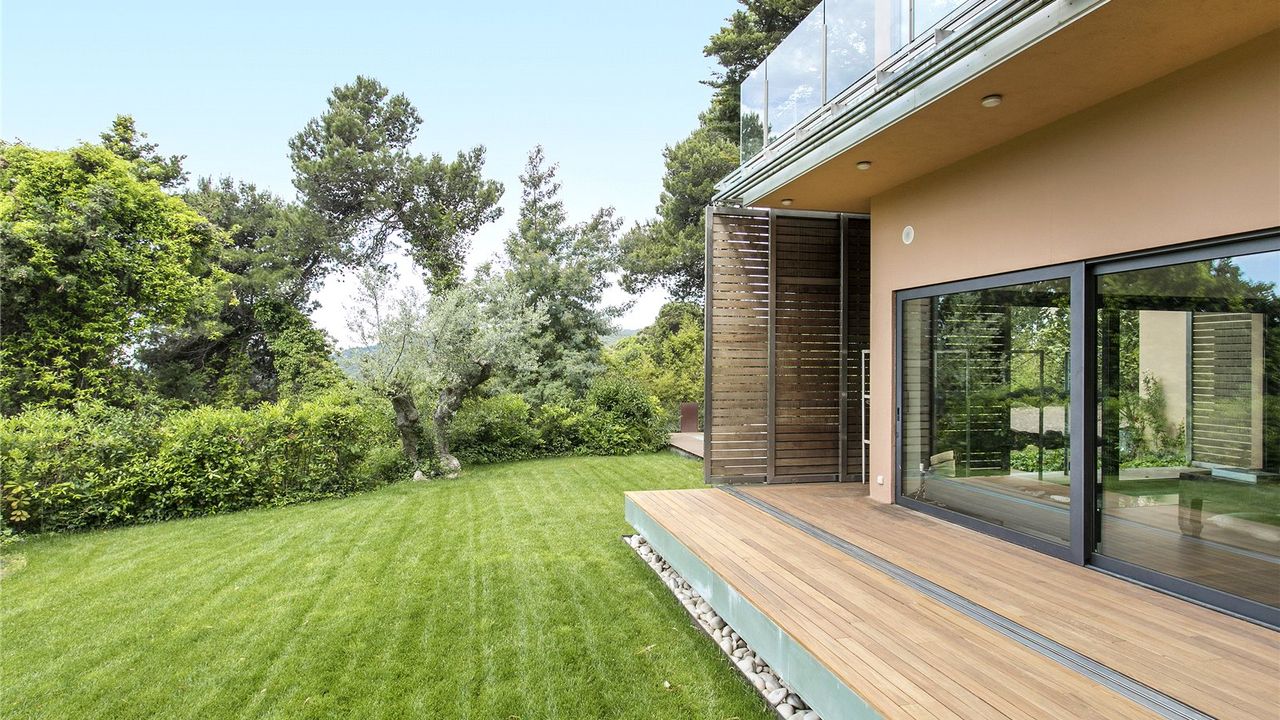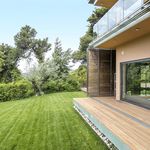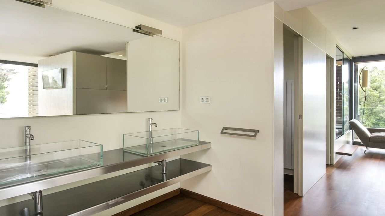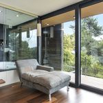 На втором этаже находятся еще одна гостиная с выходом на веранду с барбекью, 2 террасы и 3 спальни. Главная спальня имеет площадь 70 кв.м, собственную ванную, гардеробную, зону отдыха и выход на террасу. Окна от пола до потолка открывают виды на зеленый окрестности.