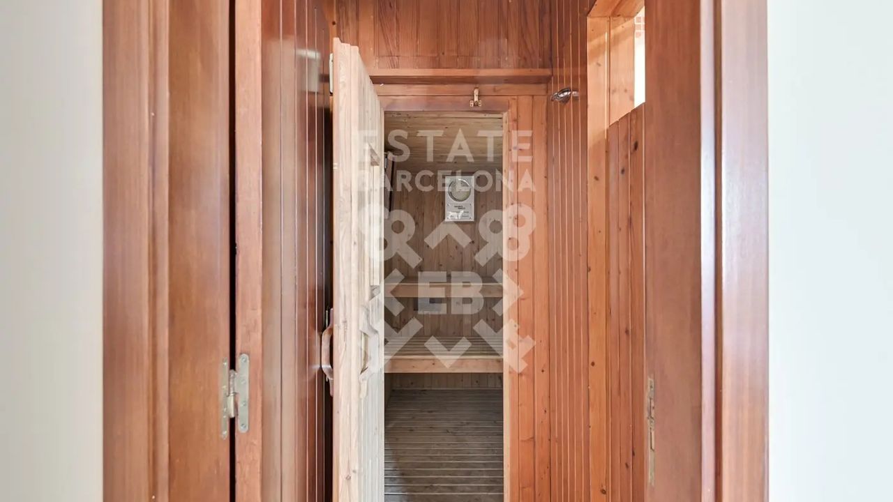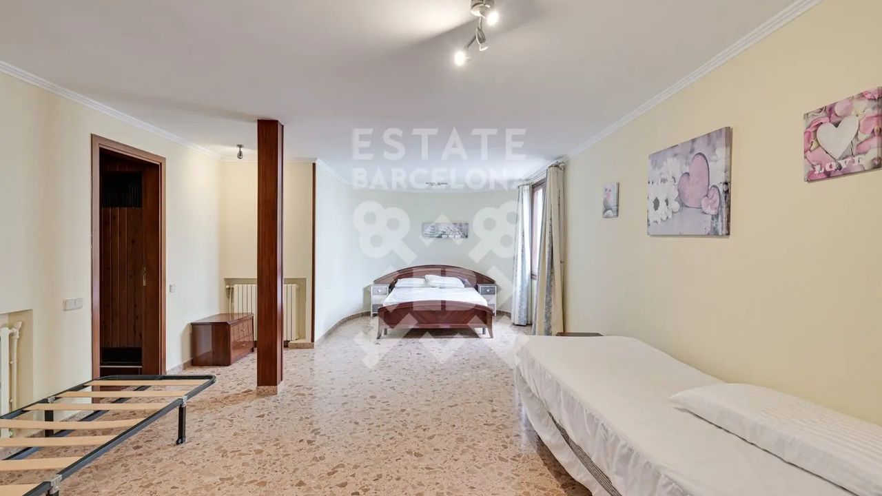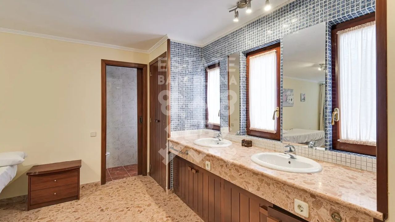 Первый этаж: пять спален, три из которых с ванными комнатами, в том числе главная спальня площадью 60 м2 с ванной комнатой, туалетом и сауной. Несколько спален с выходом на террасу и видом. Нижний этаж: закрытый гараж на два автомобиля и дополнительное складское помещение. Открытый сводный сад, частный бассейн, большие террасы, где можно круглый год наслаждаться солнцем и спокойствием этого района.