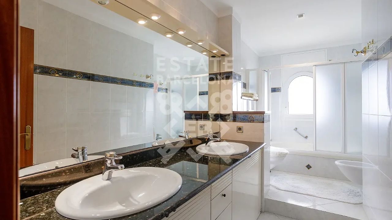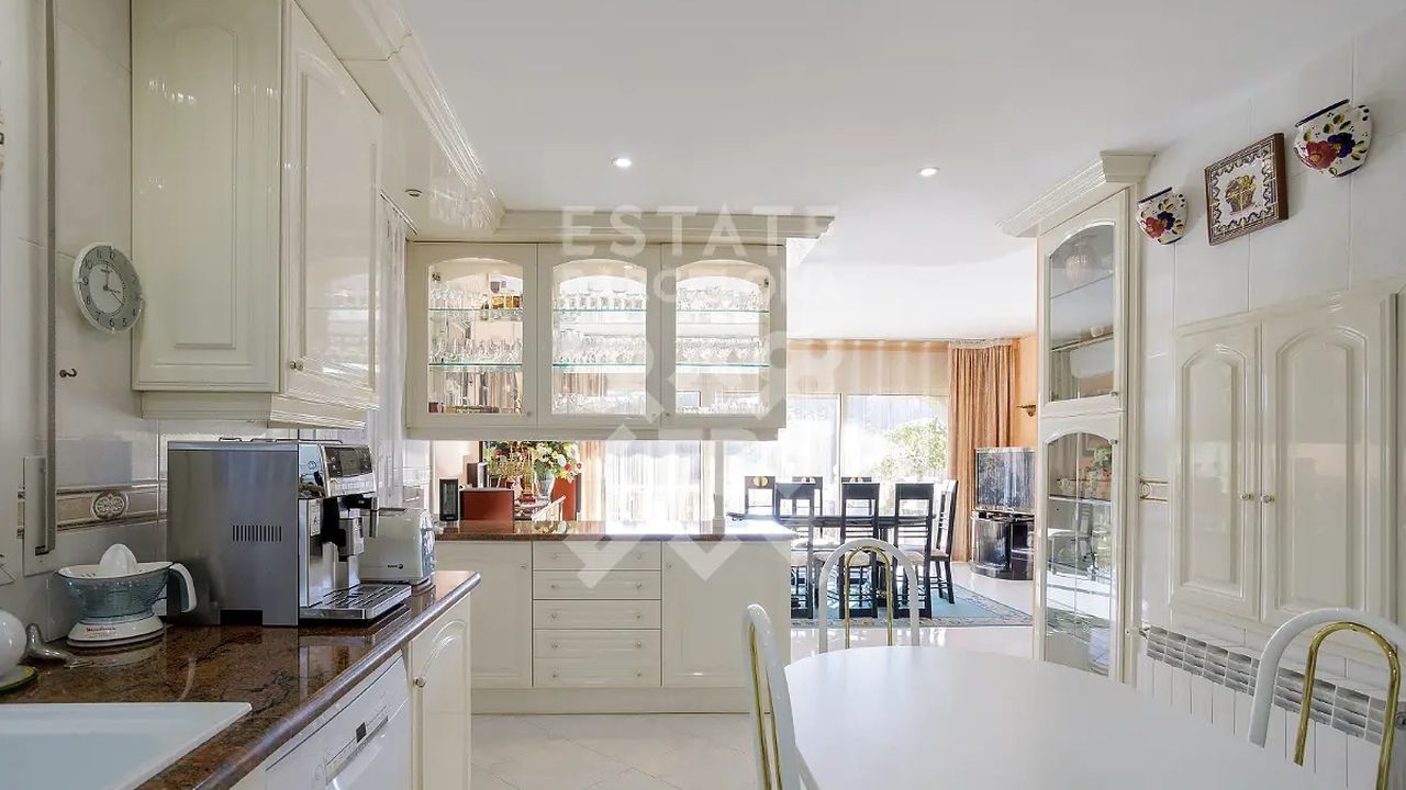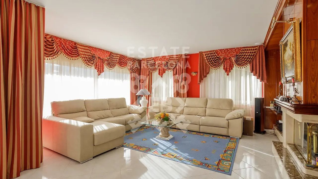Общая площадь 455 м.кв. на территории 965 м.кв. В доме 4 спальные комнаты, 6 ванных комнат, салон с выходом на террасу, кухня, несколько балконов, кабинет, сауна, гараж на 2 автомобиля.