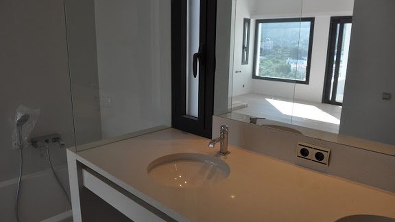 На нижнем этаже расположены прихожая со встроенными шкафами, просторная гостиная-столовая 50 кв.м. видом на залив Кадакес, лестницей из теки, камином, выходом на террасы 50 кв.м. и переливному бассейну 12х3. Кабинет со встроенными шкафами, оборудованная кухня с выходом на террасы, прачечная, котельная для подогрева полов, с/у с душем.