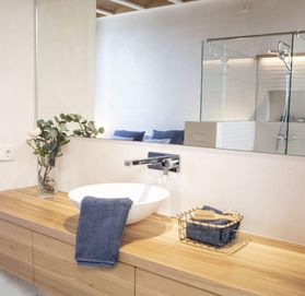 aprx.214 m2 распределены на двух этажах и великолепной верхней террасе, которая занимает почти общую постройку поверхности с небольшим джакузи и захватывающим видом на горы и монастырь Сан-Сальвадор, а также море.