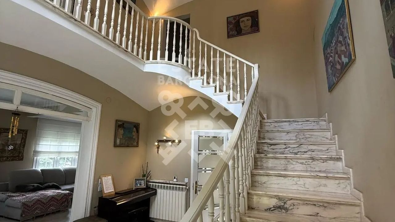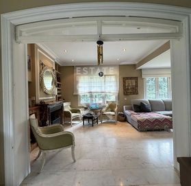 На первом этаже находится веранда с арками, просторная прихожая с оригинальным мрамором, столовая с видом на веранду и сад (оборудованная камином) и большая кухня, откуда можно попасть в подвал и туалет.