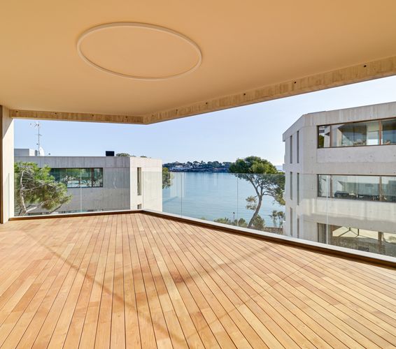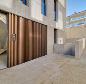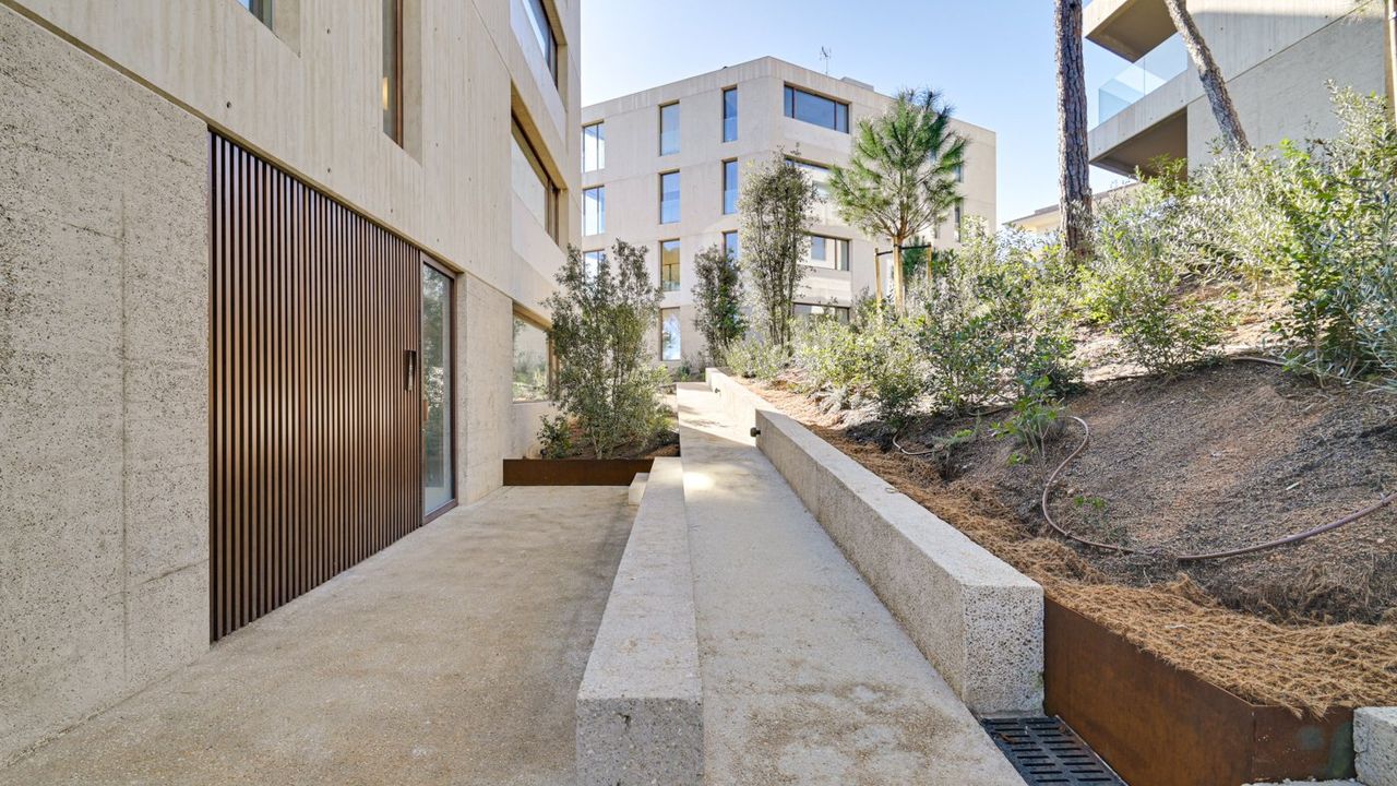 - Наружная отделка зданий выполнена при помощи архитектурного отделочного бетона, который гармонирует с цветом прибрежных скал, делая жилой комплекс визуально частью естественного природного пейзажа;