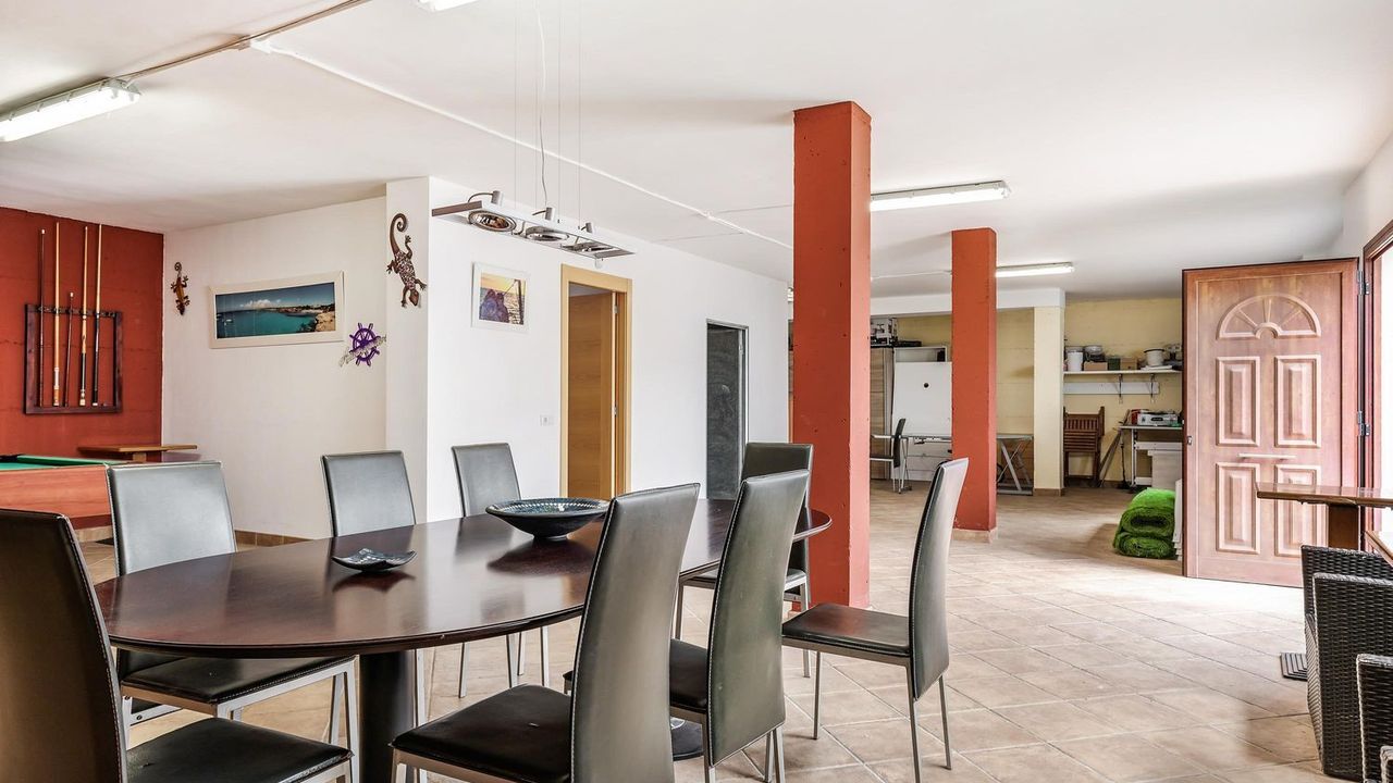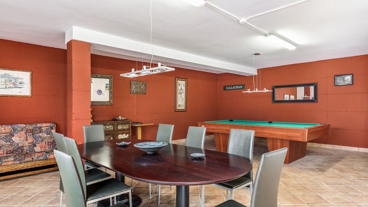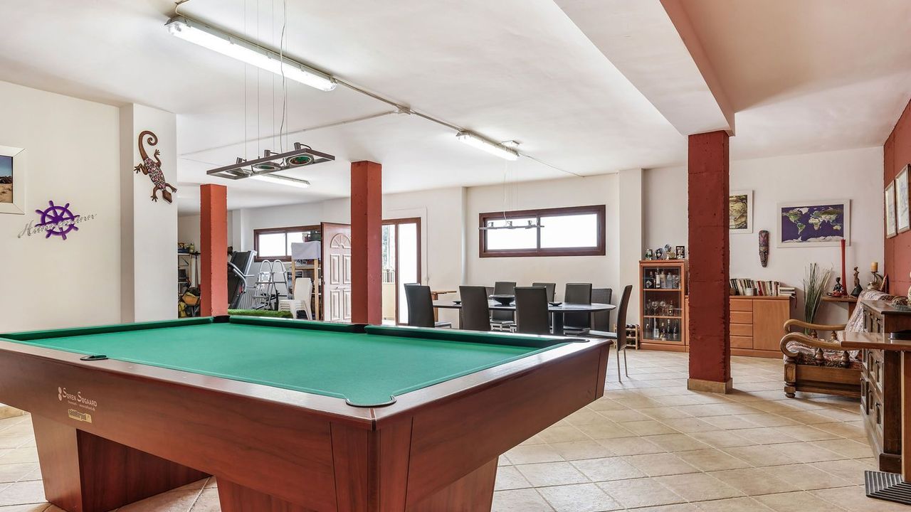 На первом этаже: прихожая, гостиная с террасой, кухня со столовой зоной, ванная комната и спальня. Террасы просторные и окружают дом с крытой верандой и потрясающим видом, вы выходите в сад в сад с местом для размещения большого бассейна. Большая многоцелевая комната с бильярдной, зоной отдыха и прачечной.